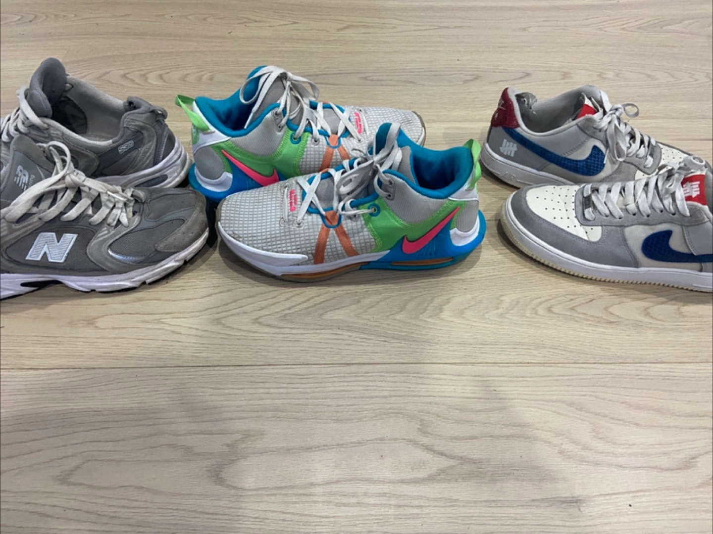 Selling a mixed lot of sneakers! Included are a pair of New Balance 530s (grey), Nike LeBron shoes (white, green, pink, blue), and Nike Air Force 1s (grey, white, blue, red). All shoes are in used condition. New balances 530 size 9- $50 Air Force 1 size 8/5 collabs - 45 LeBrons size 10/5 - 25 Take all for 100