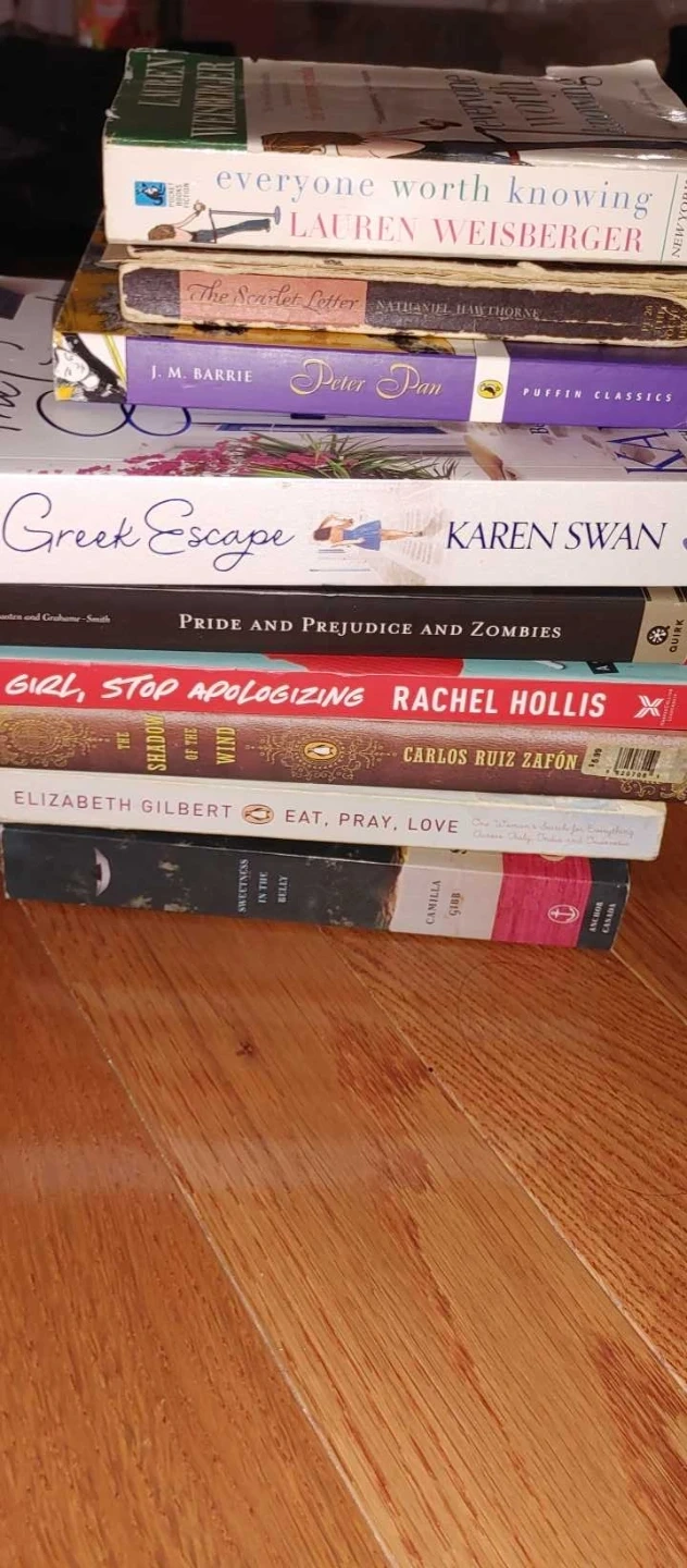 15$10 each Selling a mixed lot of books, including titles like: - Everyone Worth Knowing by Lauren Weisberger - The Scarlet Letter by Nathaniel Hawthorne - Peter Pan by J.M. Barrie - Greek Escape by Karen Swan - Pride and Prejudice and Zombies - Girl, Stop Apologizing by Rachel Hollis - Eat, Pray, Love by Elizabeth Gilbert - Sweetness in the Belly by Camilla Gibb - The Shadow of the Wind by Carlos Ruiz Zafón