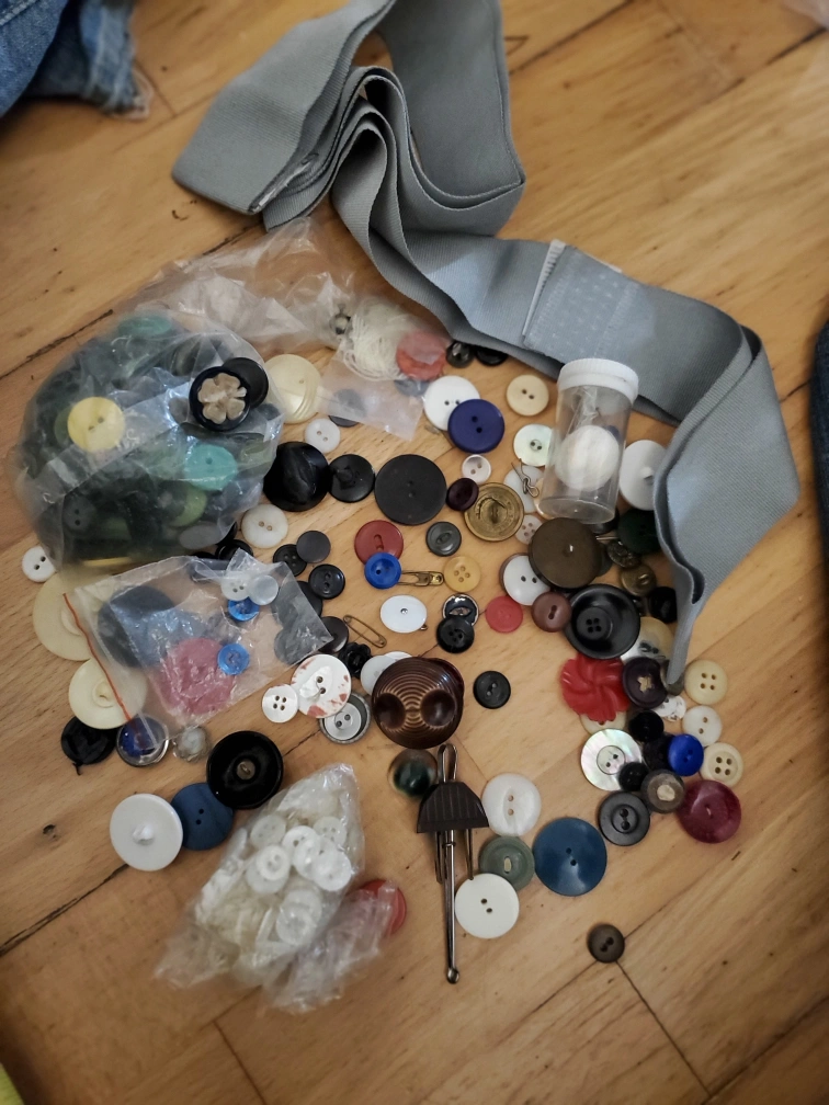 A variety of buttons in different sizes, colours, and materials, plus some sewing accessories! Great for crafting, repairs, or adding a unique touch to your projects. Cedar pick up.