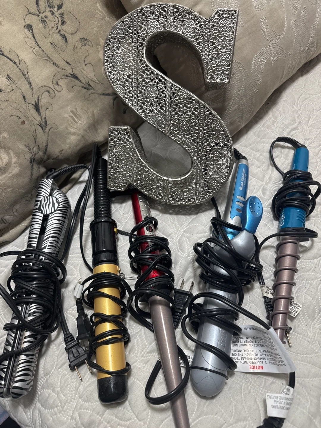Selling a mixed lot of curling irons and a flat iron. They're all in good working condition and ready for a new home! Variety of sizes and styles