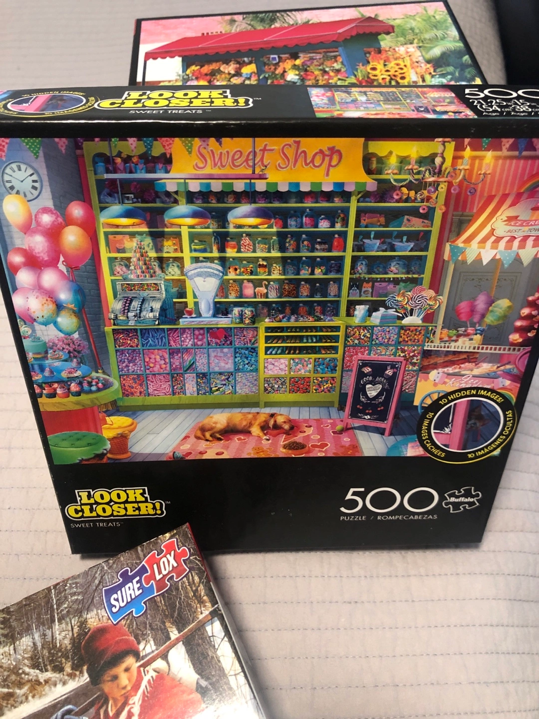 Selling a mixed lot of puzzles in great condition! Included are: - Kodak Premium Puzzle - Side Street Colorful Flower Market (550 pieces) - Sure-Lox Kevin Daniel Puzzle (500 pieces) - Look Closer! Sweet Shop Puzzle (500 pieces) - Gary Patterson Outside Play Puzzle (1000 pieces)