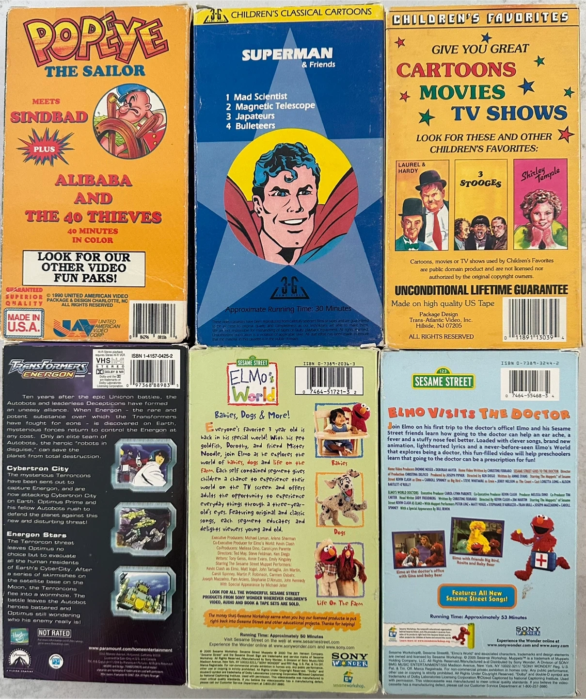 15Selling Rare and Vintage VHS tapes, perfect for collectors or those looking for a bit of nostalgia! Includes a variety of cartoons, movies, and TV shows for kids and adults. Titles include Popeye, Superman, The Three Stooges, Sesame Street, Winnie the Pooh, and more! Price is per VHS.