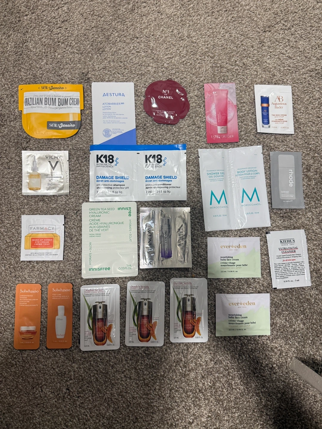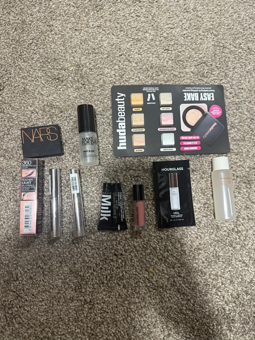various makeup samples all brand new. 2 Hourglass mascara 2 Milk makeup primers 1 Hourglass primer sample 1 Huda Beauty powder 1 Nars blush 1 Makeup Forever setting spray 1 intense volume lancome mascara 1 Sulwhasoo makeup remover cleansing oil + 20 skincare samples Take all for $5