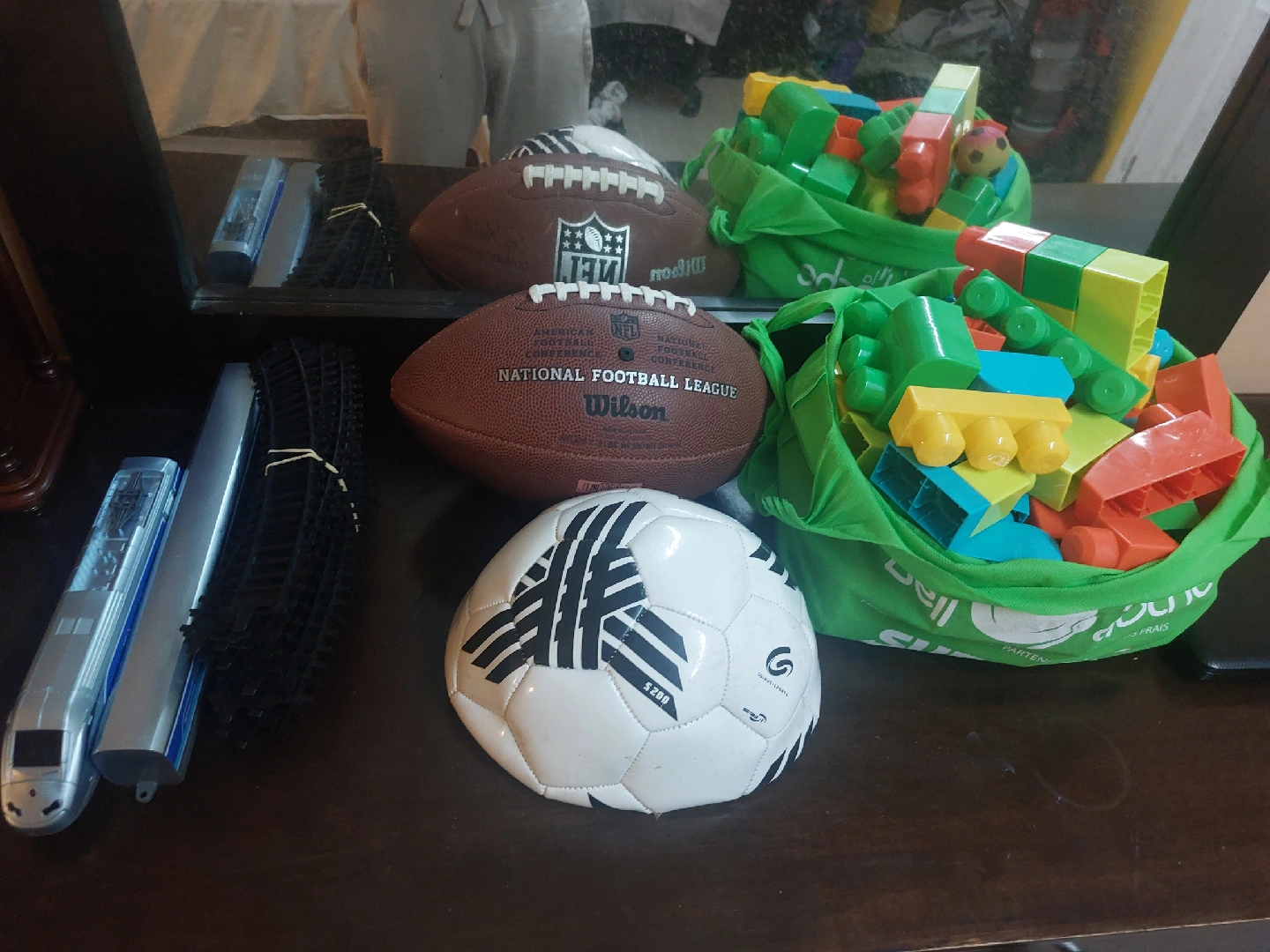20Selling a collection of mixed toys! Includes two footballs (one Wilson NFL), a soccer ball, a toy train set with tracks, and a bag of colourful building blocks. Perfect for keeping the little ones entertained!
