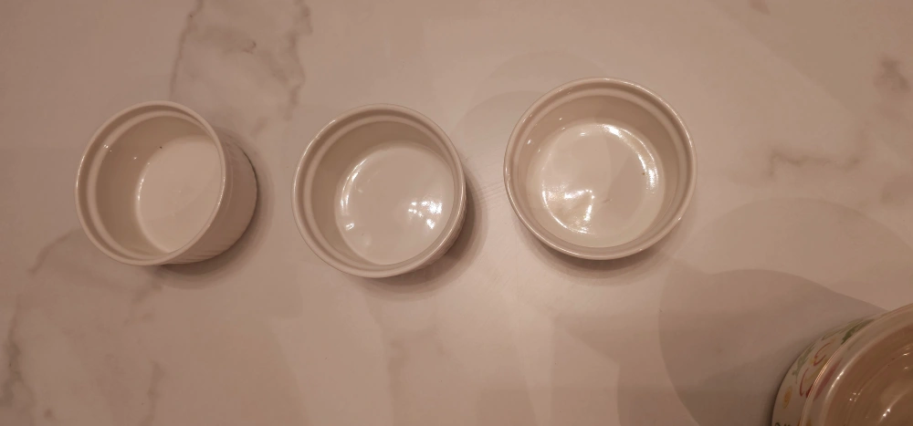 Selling a set of kitchen bowls and ramekins! Includes stainless steel mixing bowls and white ramekins. Also includes a mug with a lid that says "Living my fresh life". Great for baking or everyday use in the kitchen