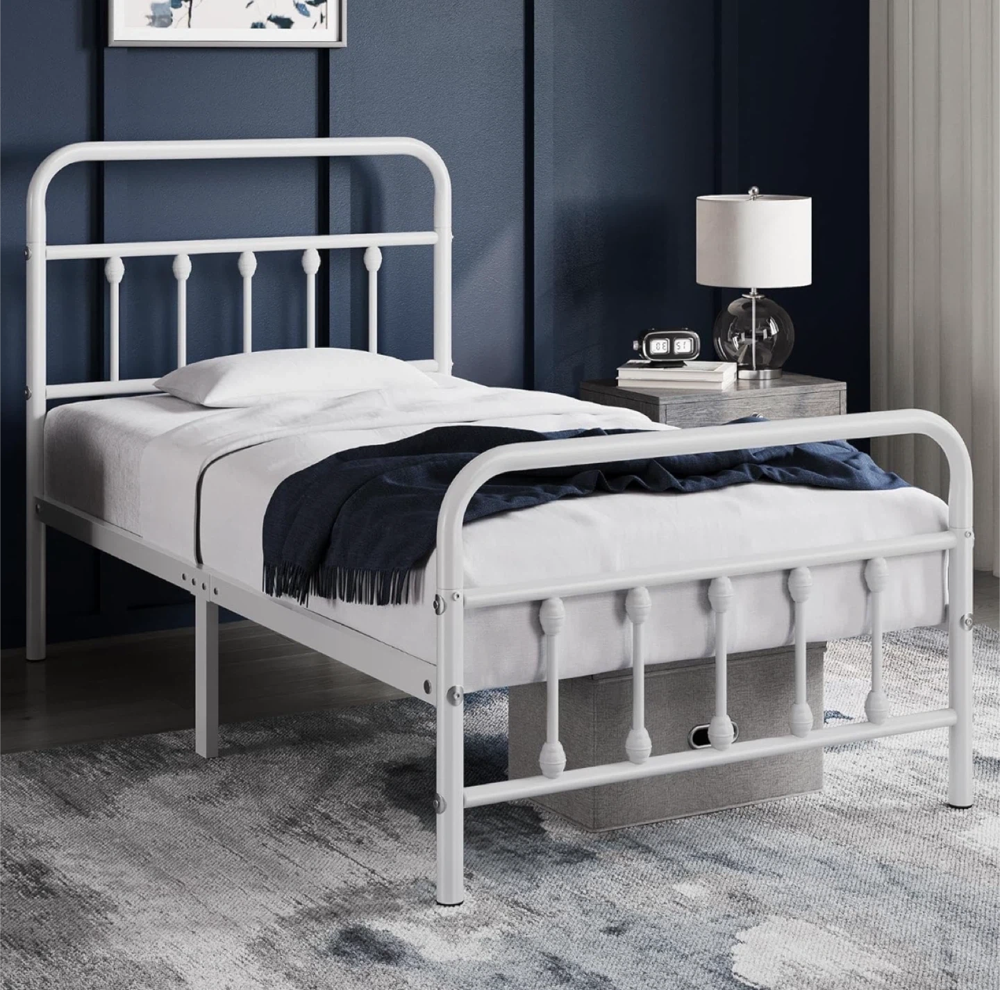 This is a white metal twin bed frame. It measures 77" long by 41.5" wide. The bed has built-in slats to prevent the mattress from sliding. Max weight capacity is 450 lb.In perfect condition. I can also give my mattress for free along with the frame. No bed bugs.
