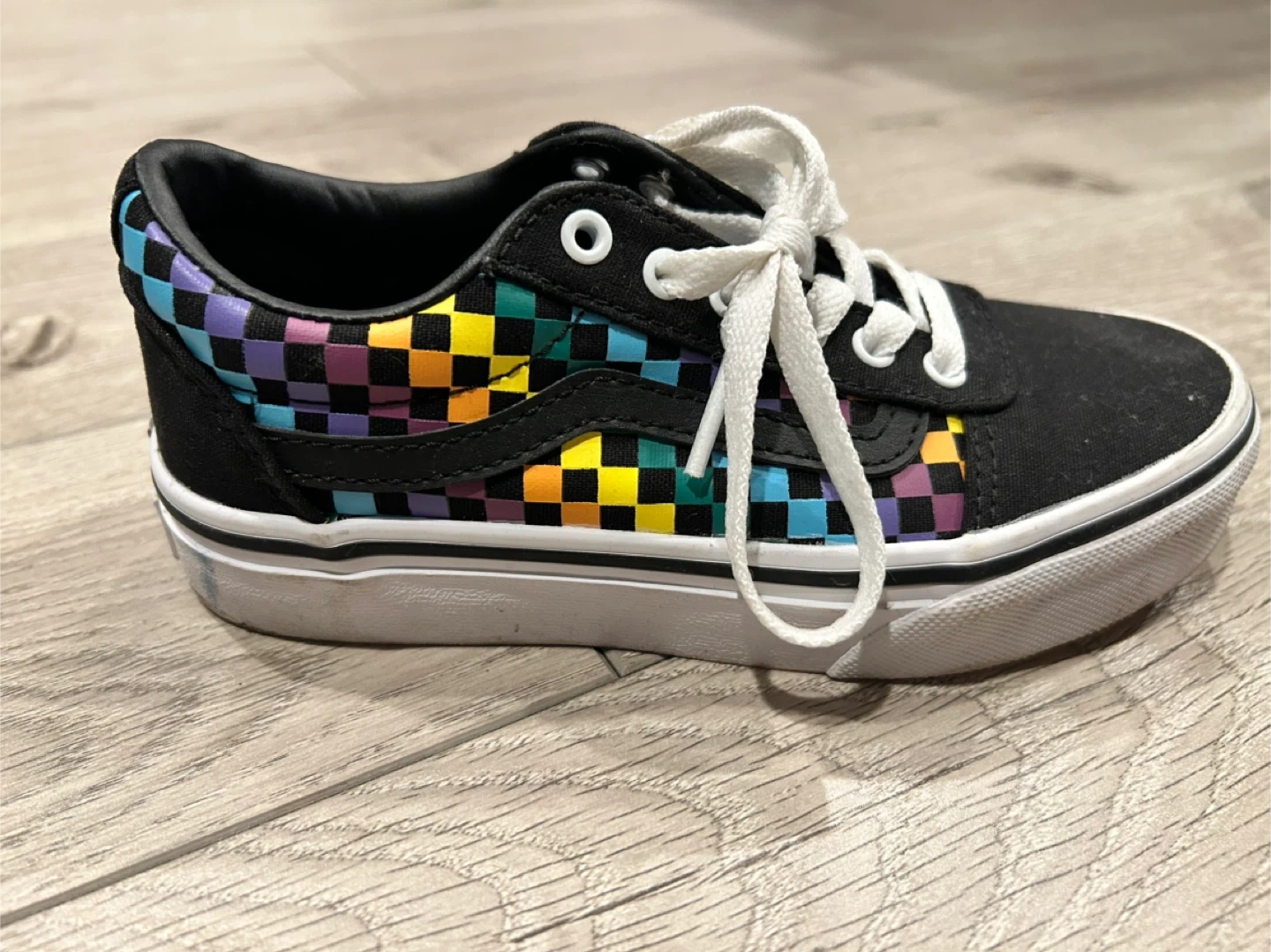Classic Vans sneakers featuring a black base with a colourful checkerboard pattern. These are a kid's size 13