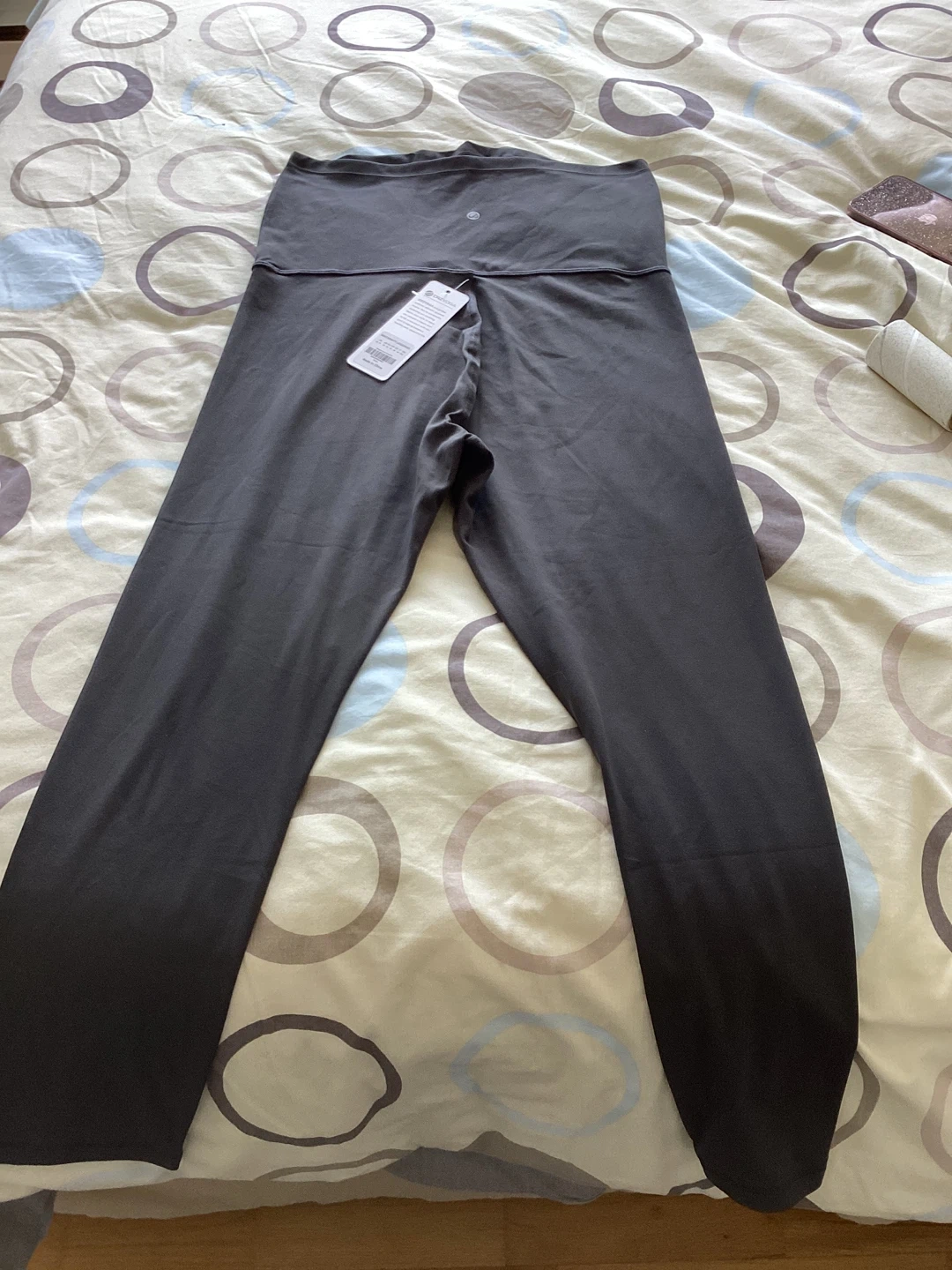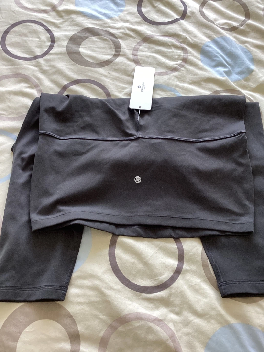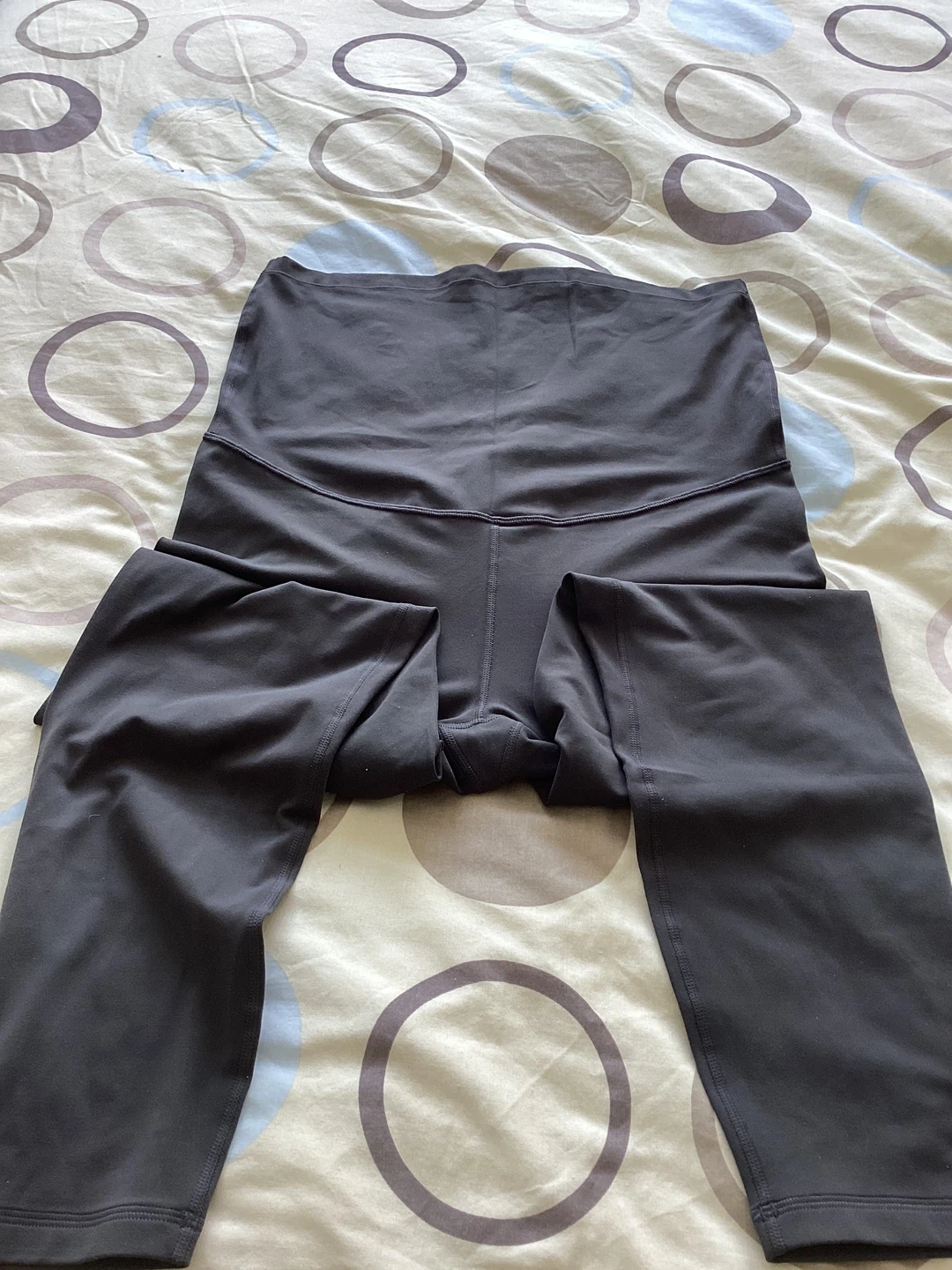 These are XL CRZ dark grey Yoga Butterluxe maternity leggings. They're made from a polyamide and lycra blend with a brushed, 4-way stretch fabric. The super high waist and elastic maternity panel offer comfort during pregnancy and postpartum. Pocketless version