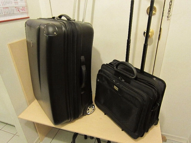 Both suitcases are in good condition. 1. HEYS hard shell, expandable suitcase (tan color): 24" long, 16" wide, 12" deep, can expand 2-3 inches, has 4 spinner wheels - SOLD. 2. PORT expandable, carry-on suitcase: 16" long, 14" wide, 8" deep, with multiple pockets and compartments, shoulder strap, collapsible telescopic handle, has 2 wheels - $40. Let me know if you're interested!