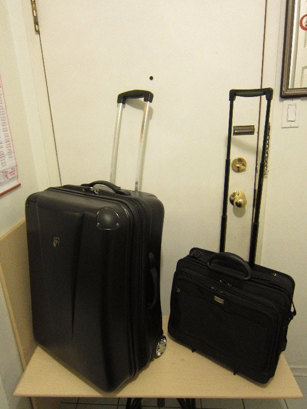 Both suitcases are in good condition. 1. HEYS hard shell, expandable suitcase (tan color): 24" long, 16" wide, 12" deep, can expand 2-3 inches, has 4 spinner wheels - SOLD. 2. PORT expandable, carry-on suitcase: 16" long, 14" wide, 8" deep, with multiple pockets and compartments, shoulder strap, collapsible telescopic handle, has 2 wheels - $40. Let me know if you're interested!