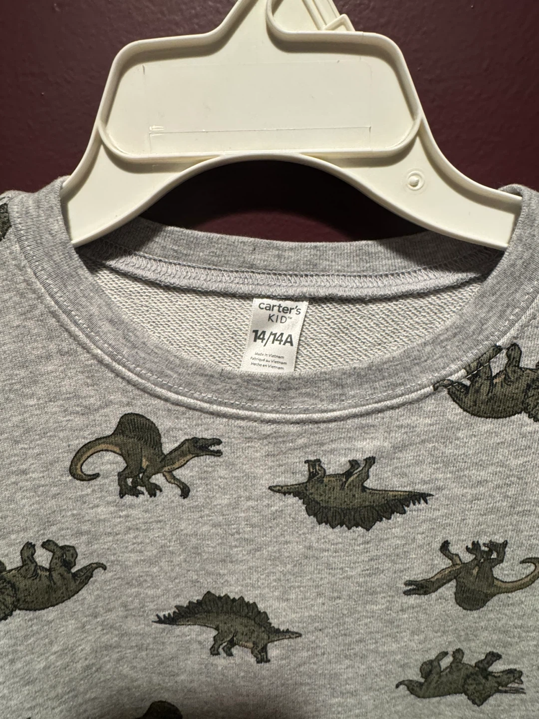 1 / 41 / 4Buy & SellCarter's Kids Gray Dinosaur Sweatshirt Size 14Carter's Kids Gray Dinosaur Sweatshirt Size 14$10Carter's Kids sweatshirt featuring a fun dinosaur print! The shirt is size 14 and made of 60% cotton and 40% polyesterConditionGoodWHERE TO MEETDollar TreeView MapSELLERverifiedKathyEast Meadow600 reviews0 chats·0 favorites·4 viewsSEND CHAT TO SELLERHi Kathy! I’m interested in your listing.Hi Kathy! I’m interested in your listing.Get the Karrot app to chatSign In to chat