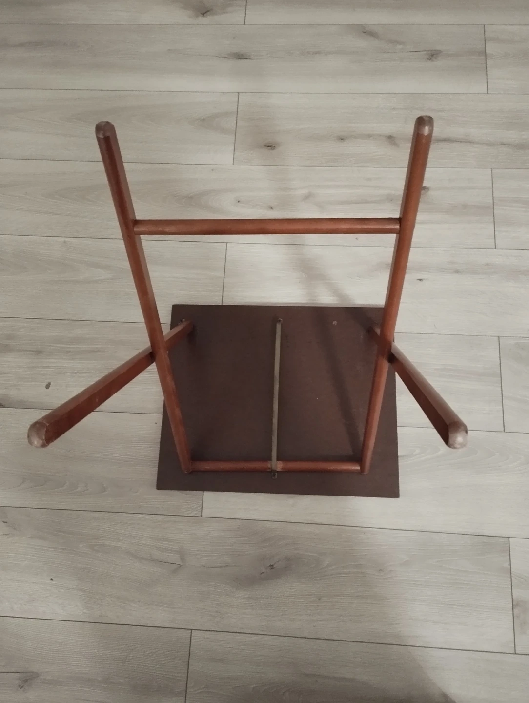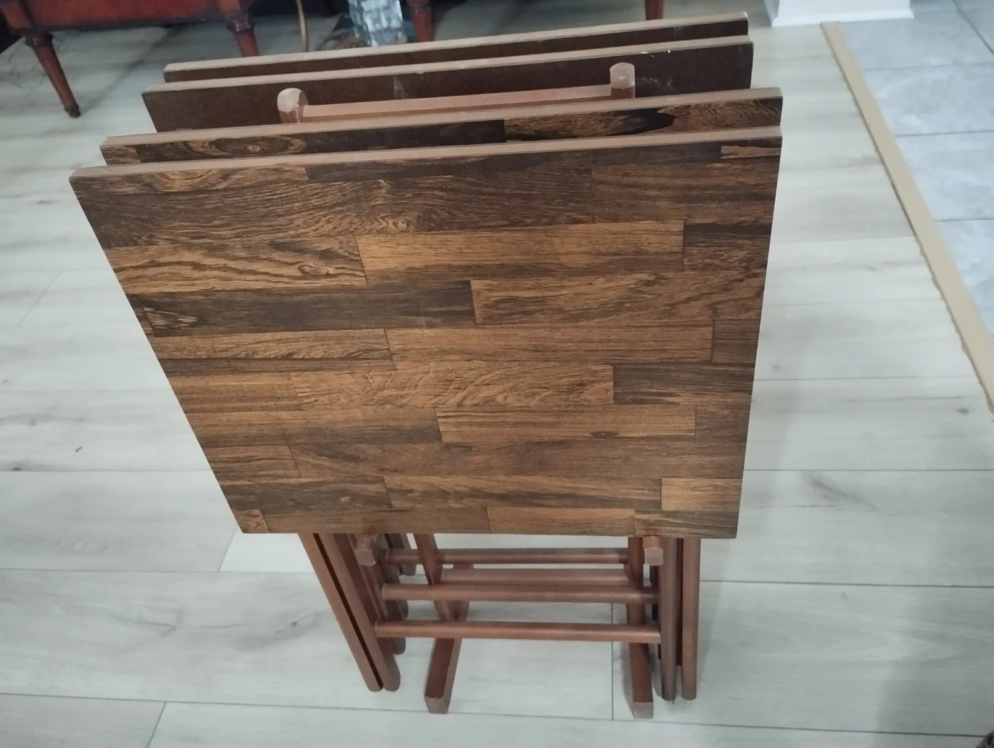 A set of four wooden TV tray tables with a wood-grain laminate top. These tables are foldable for easy storage. They're great for snacks or casual meals.