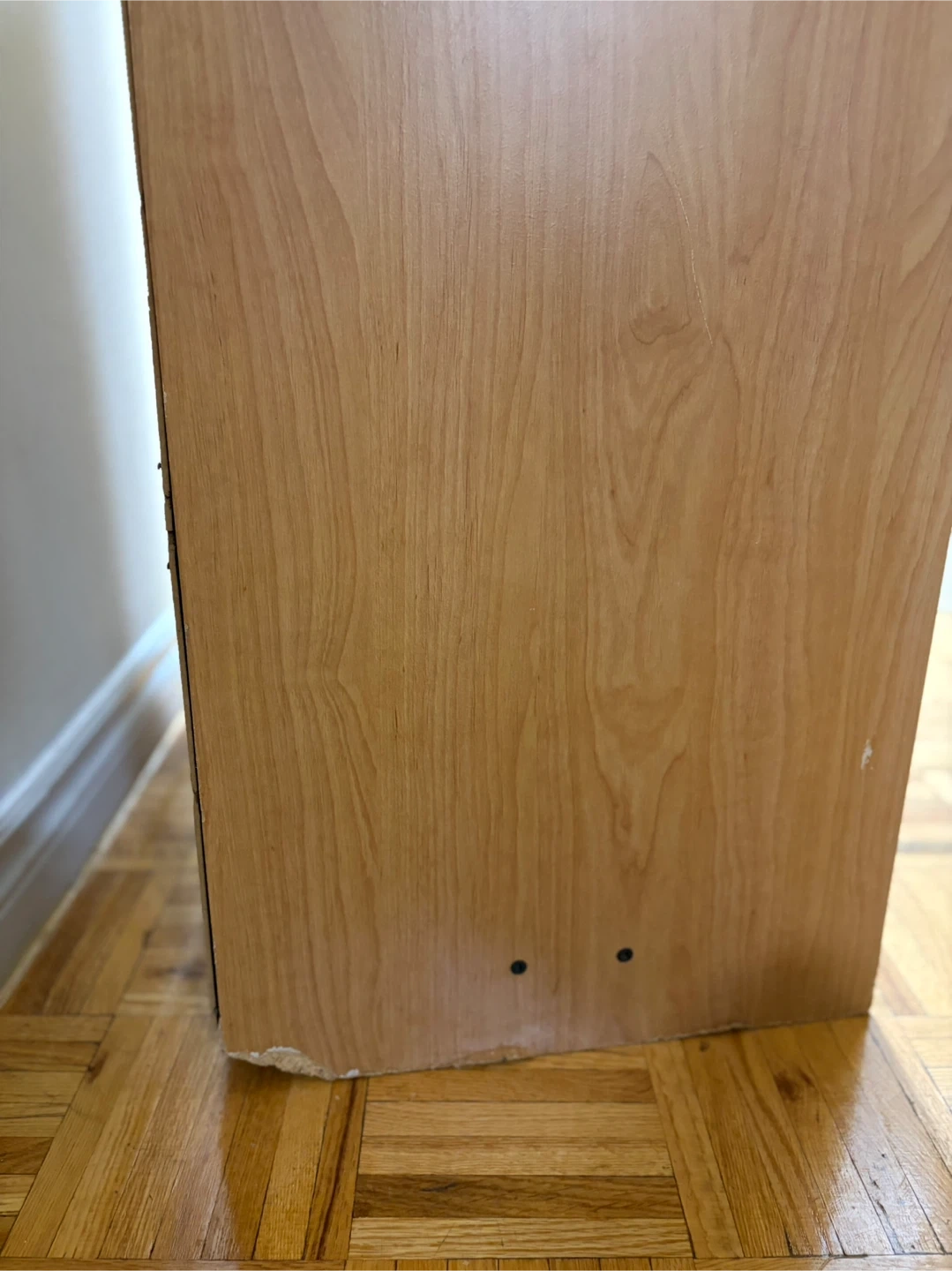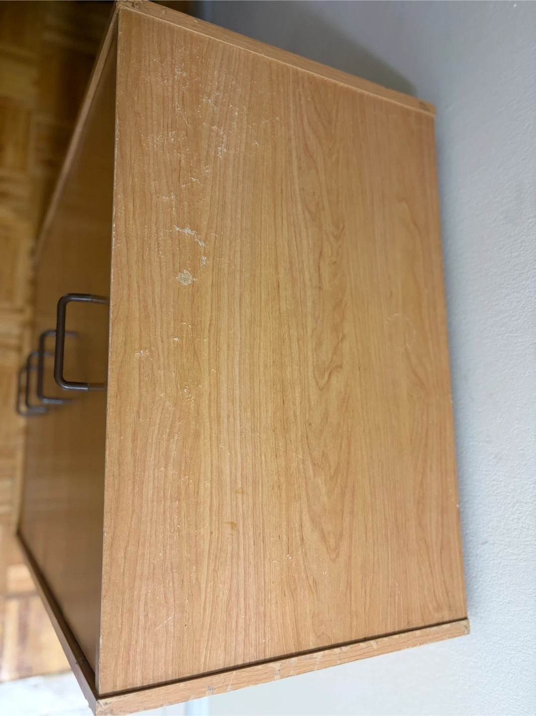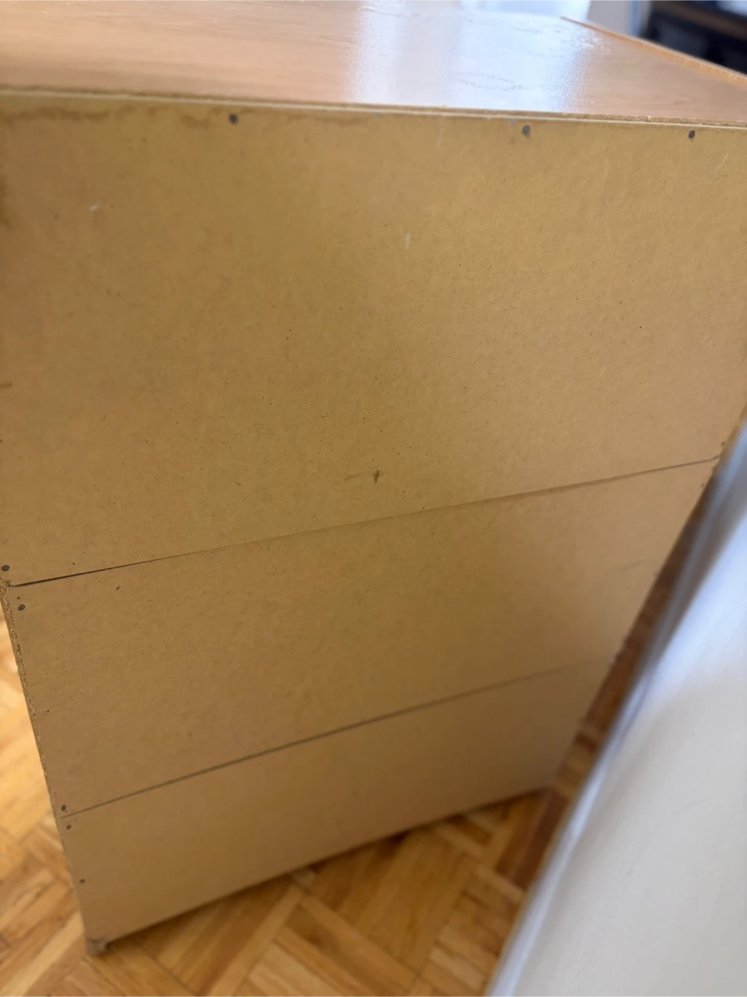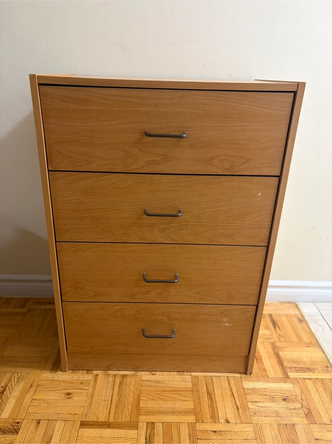 A light wood dresser with four drawers. It's great for storing clothes or other items. Some minor wear on the bottom edge.