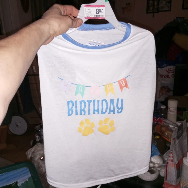 This is a white "Happy Birthday" tee with blue lettering and paw prints. It's a size large. Perfect for your furry friend's special day!