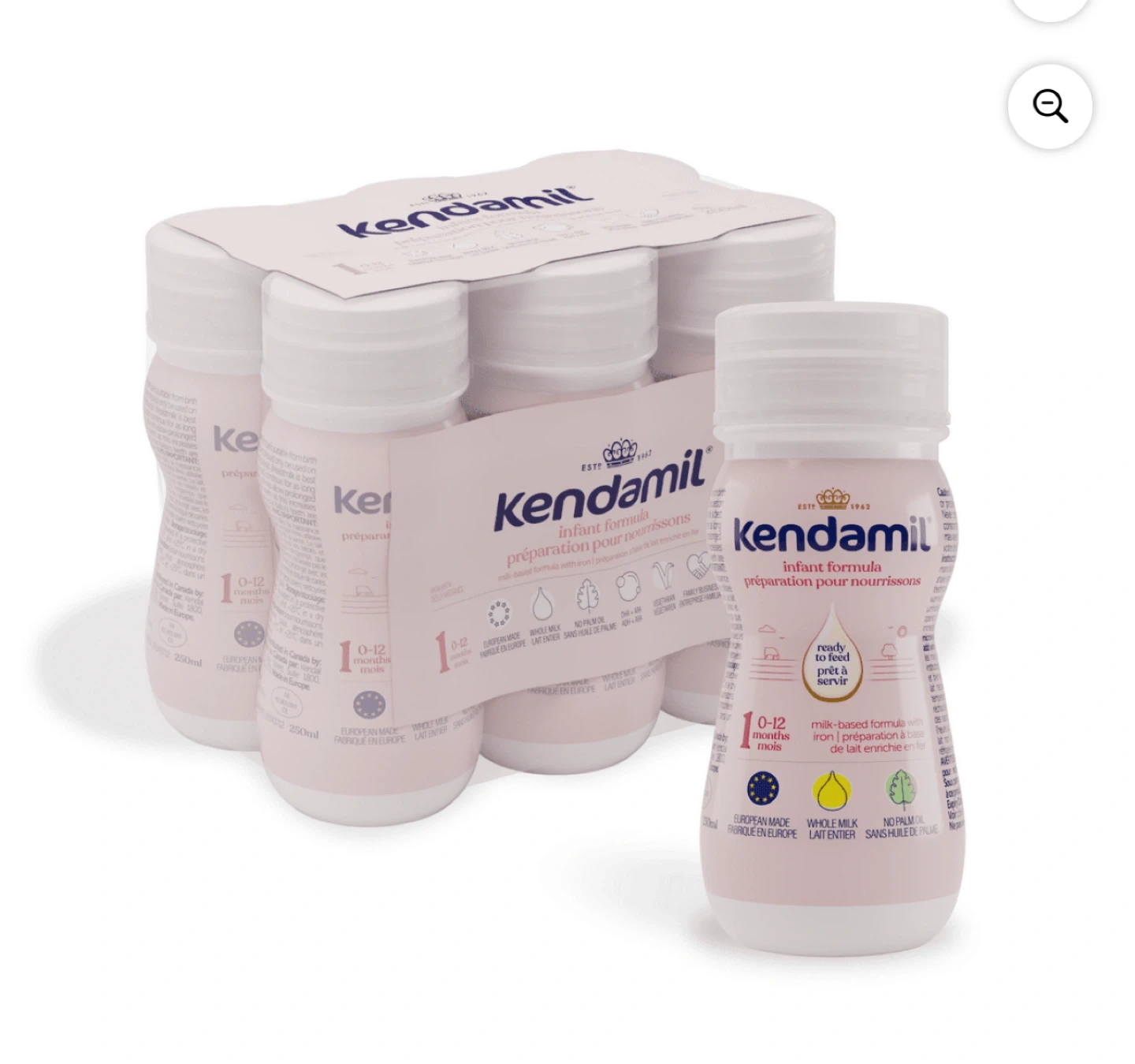 Giving away a pack of Kendamil infant formula, perfect for little ones aged 0-12 months! This milk-based formula with iron is ready to feed and made with whole milk, without any palm oil. Each bottle contains 250ml, and the packaging is in French and English.