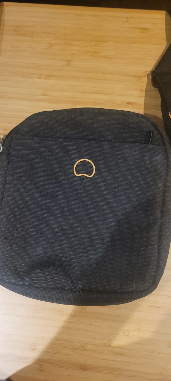 This Delsey crossbody bag is black with a nylon exterior and a grey fabric interior. It features a zippered main compartment and an adjustable strap for comfortable wear. Its compact size makes it handy for everyday essentials.