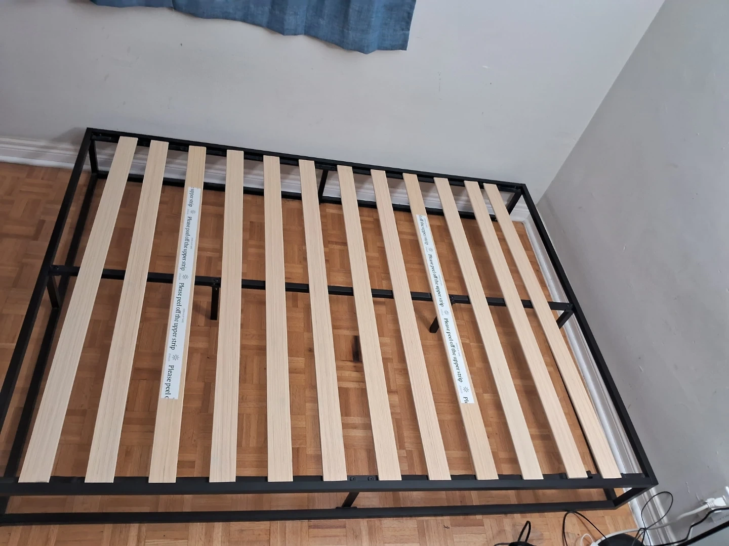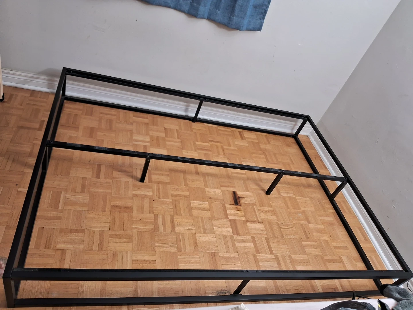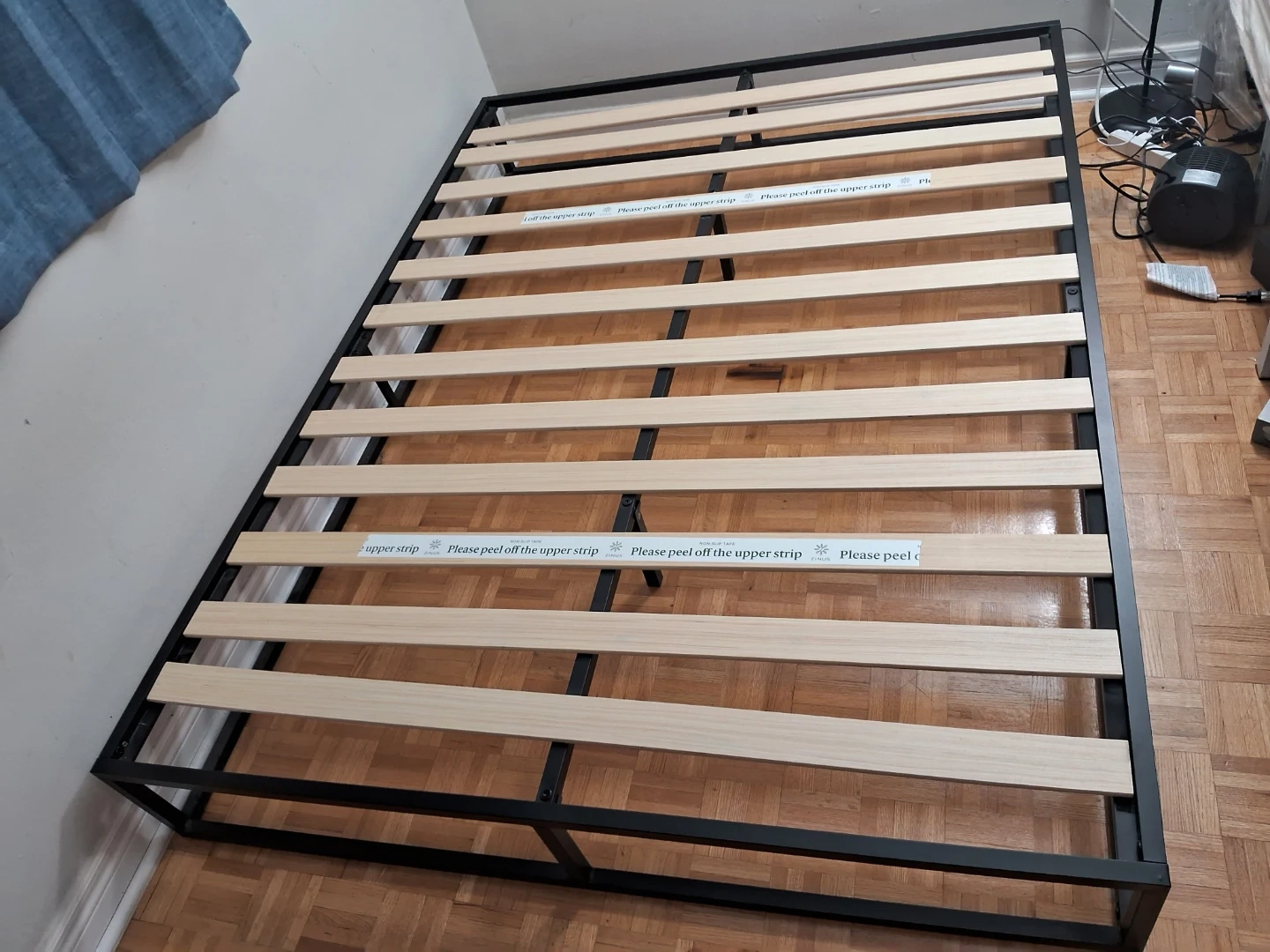 This is a Zinus Joseph 10 inch metal platform bed frame. It features wooden slats and a black metal base. It's 10 inches high.