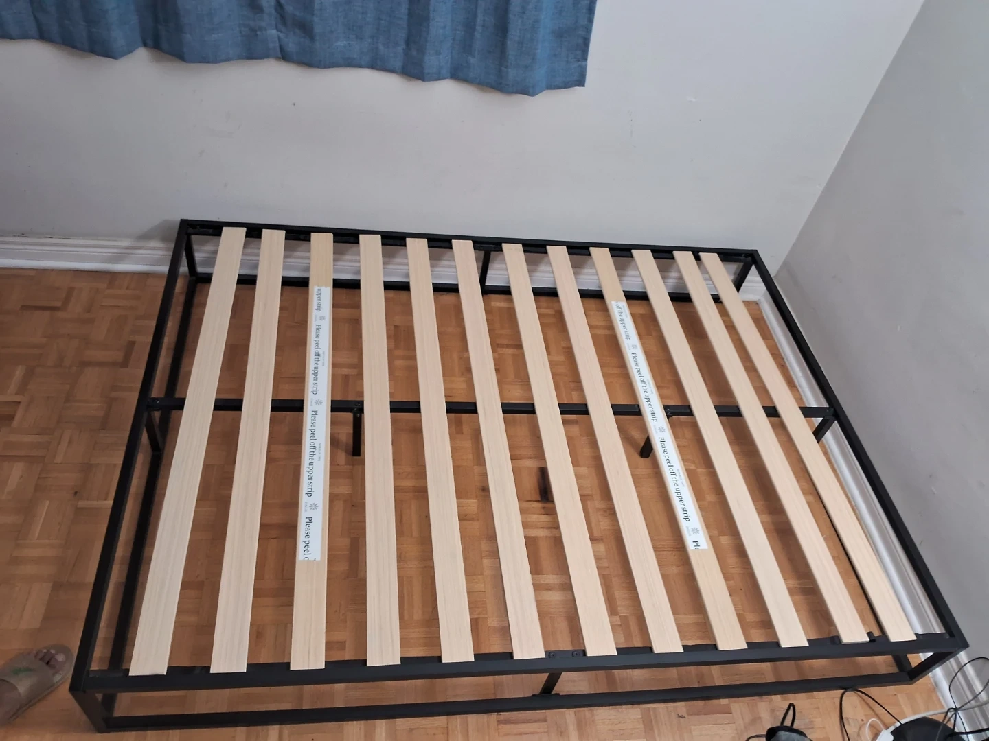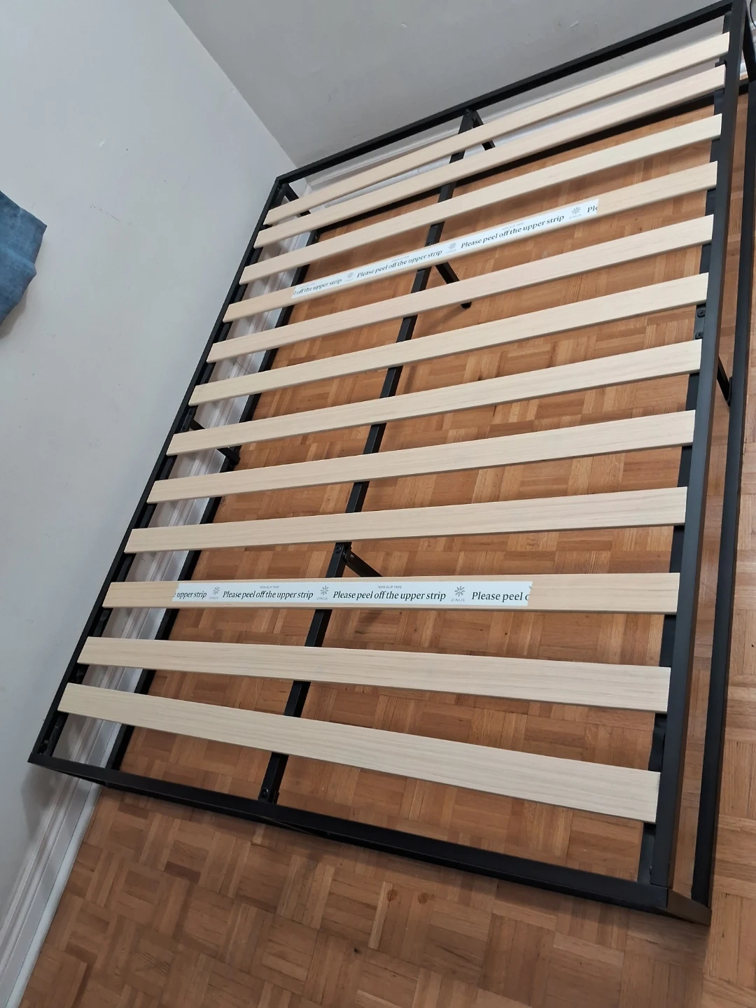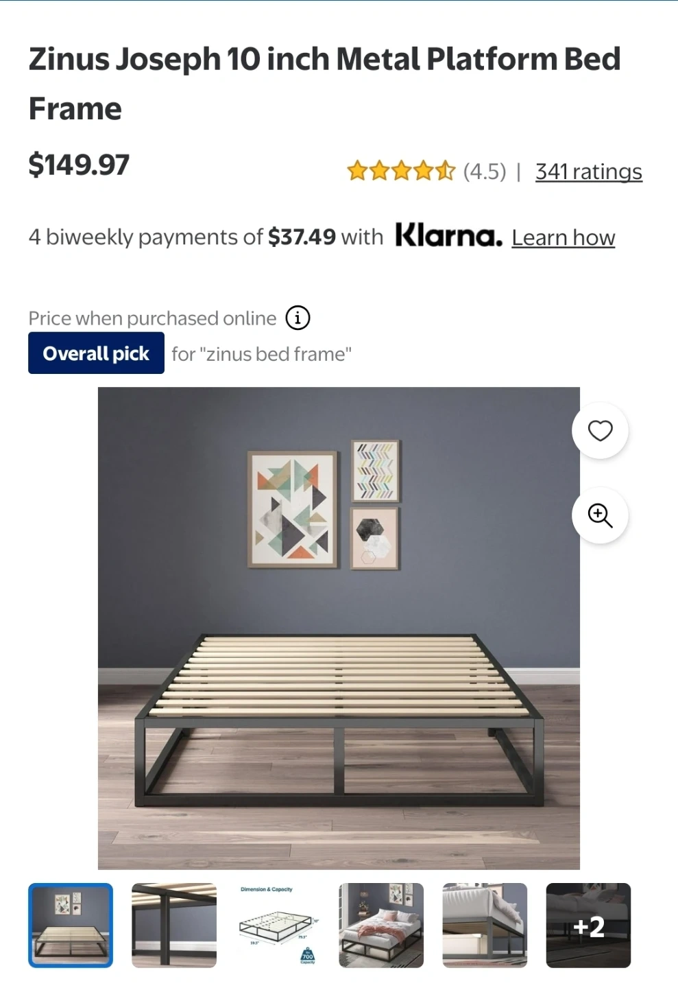 This is a Zinus Joseph 10 inch metal platform bed frame. It features wooden slats and a black metal base. It's 10 inches high.