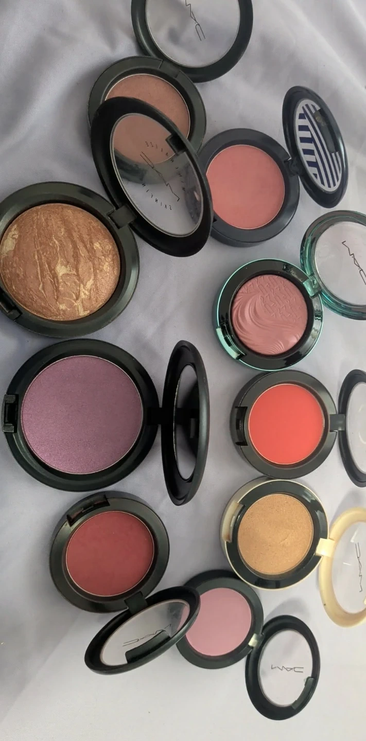 A collection of MAC pressed powder blushes and bronzers in various shades. These makeup items are known for their blendable formulas and pigment. Great for adding colour and dimension to the face.