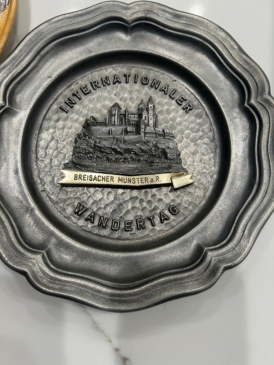 This pewter plate features a detailed relief of a castle and the text 'Internationaler Wandertag Breisacher Munster a.R.' It's a decorative item with a rustic, hammered finish. A great piece for collectors of travel memorabilia or unique wall decor