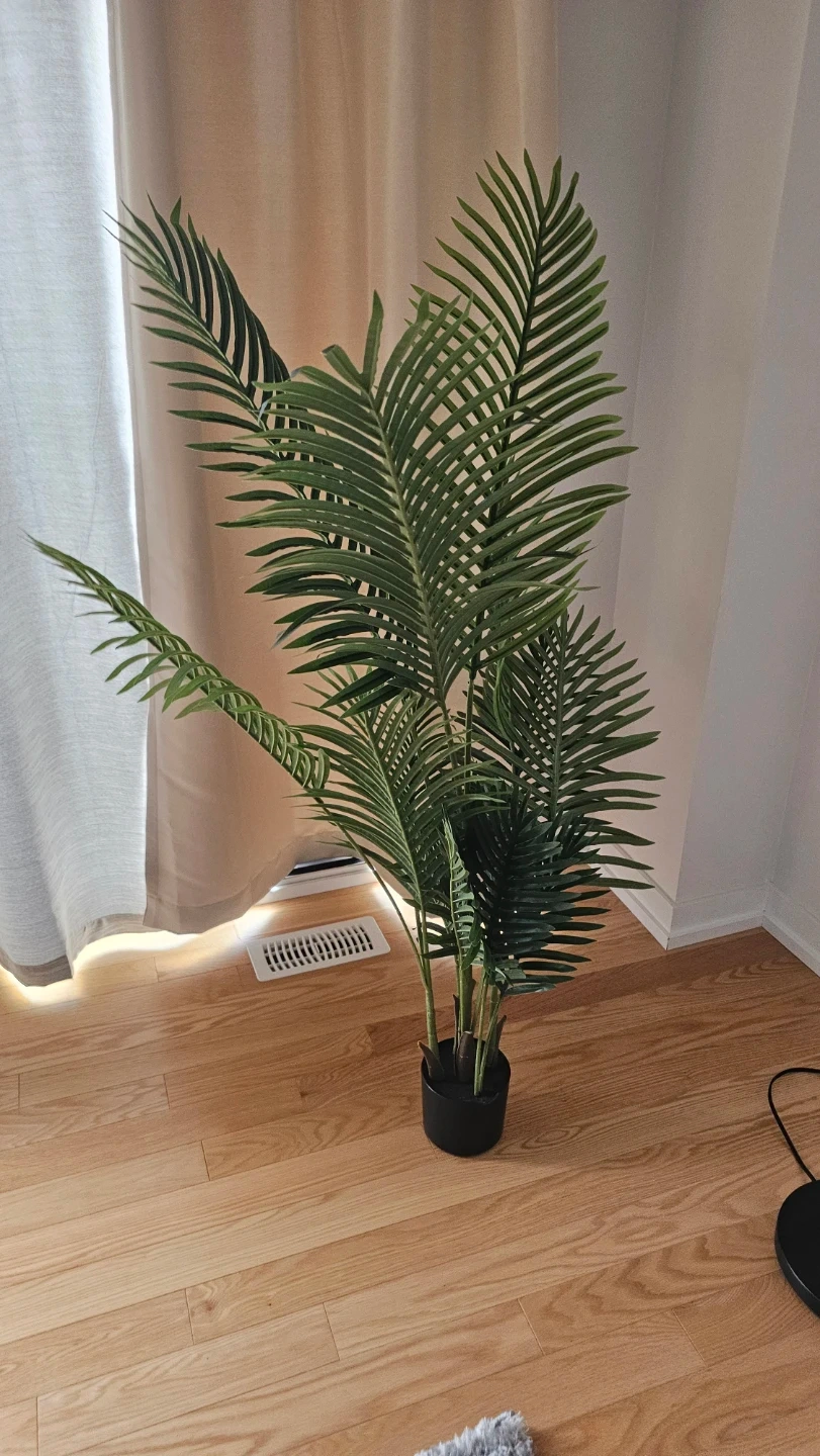 A lifelike artificial Areca palm plant in a black pot. It's great for adding a touch of green to any room. The plant has realistic leaves and a sturdy base.