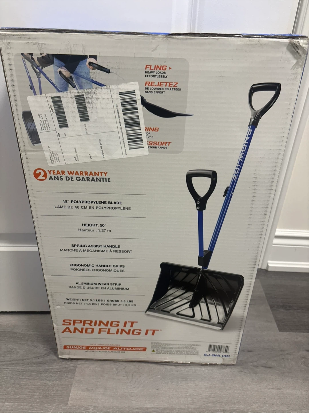 This Snow Joe shovel features a 18" polypropylene blade and ergonomic grips. It has a spring assist handle for strain reduction and an aluminium wear strip. The shovel weighs 3.1 lbs.