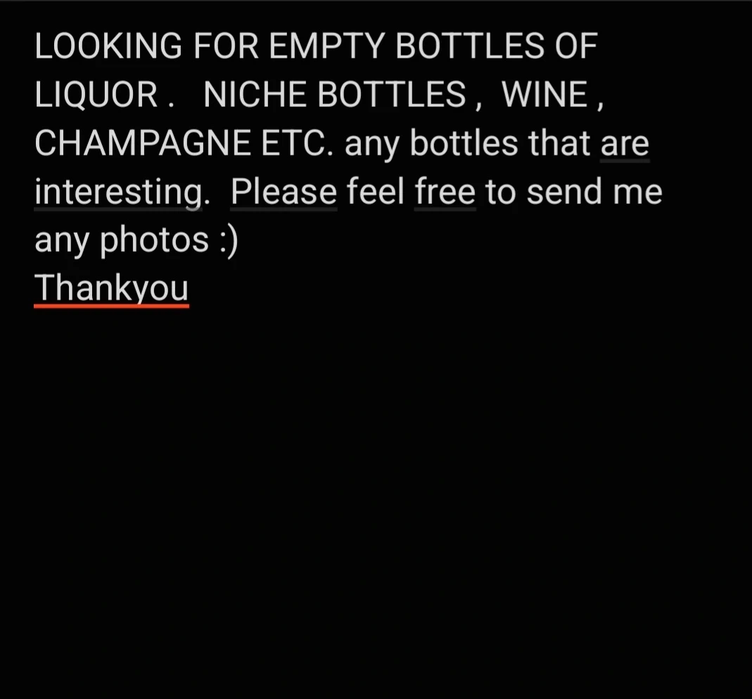 Looking for interesting empty bottles of liquor, niche bottles, wine, and champagne. Please feel free to send photos of any bottles you have. These bottles are sought after for their unique shapes and designs.