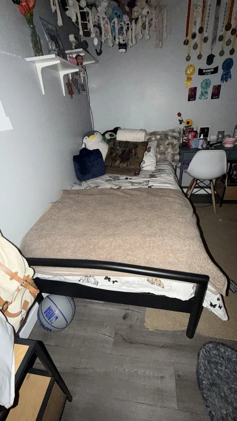 Selling a twin-sized bed frame with a light grey mattress included. The frame is made of black metal and is simple, sturdy, and ready for a new bedroom.