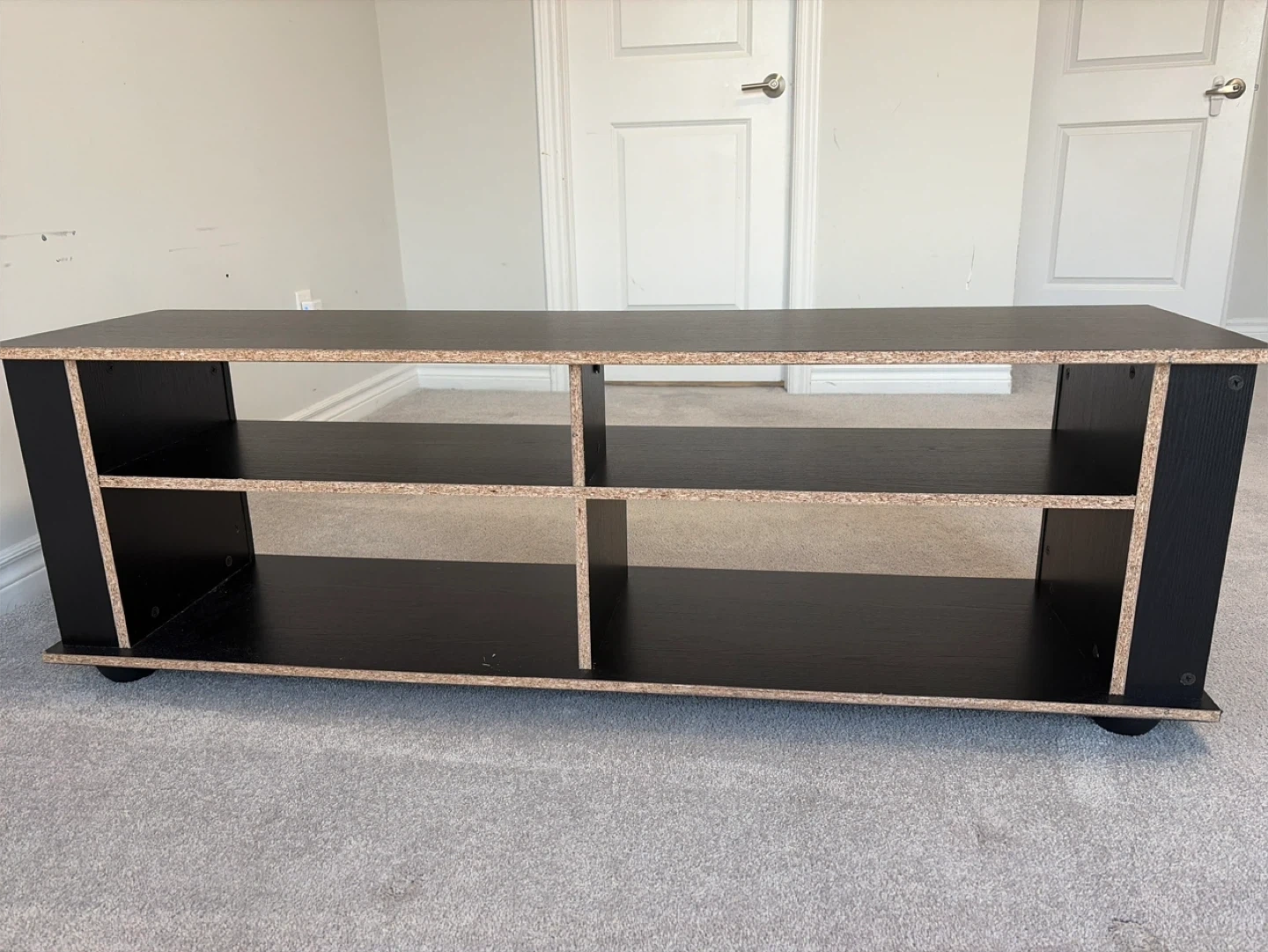 This is a black TV stand with multiple open shelves for storage. It's made of laminate wood and has a sleek, modern design. Perfect for holding electronics and media accessories.