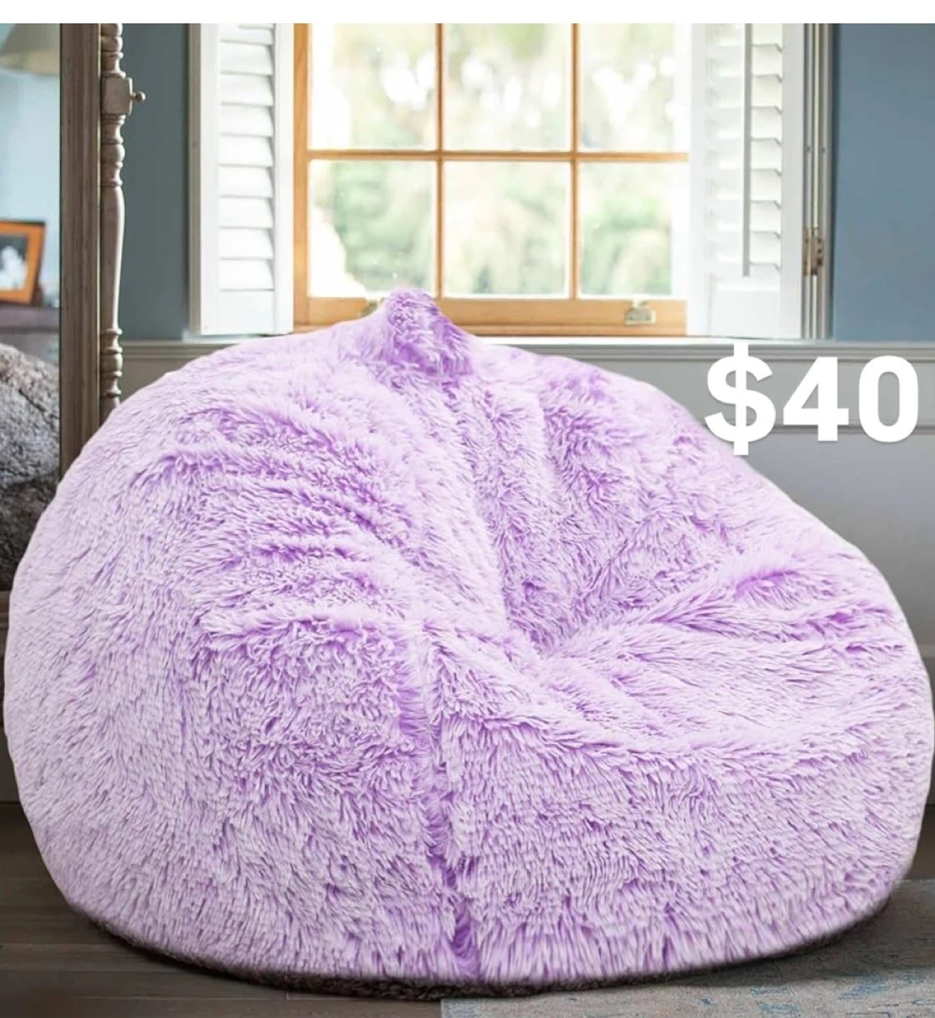 Selling a super comfy purple furry bean bag chair! It's in great condition and ready to add some cozy vibes to your space. It's a great size for lounging and relaxing