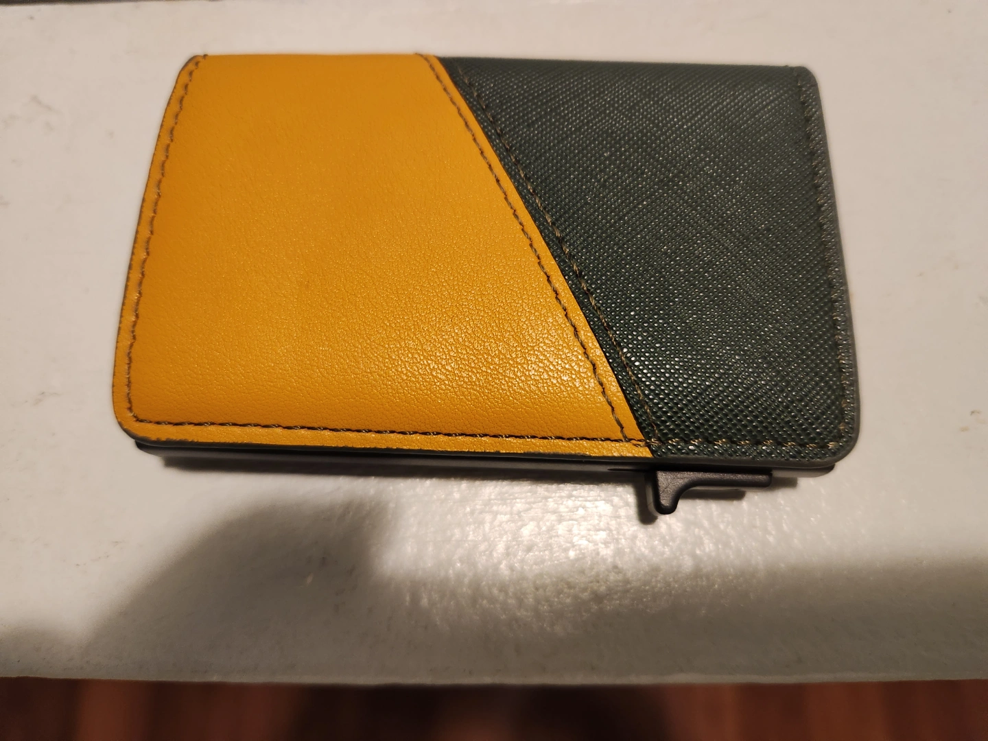 Slim RFID Metal wallet. Two-toned design. Mustard yellow and forest green. Multiple card slots. Compact and minimalist design. Excellent condition.
