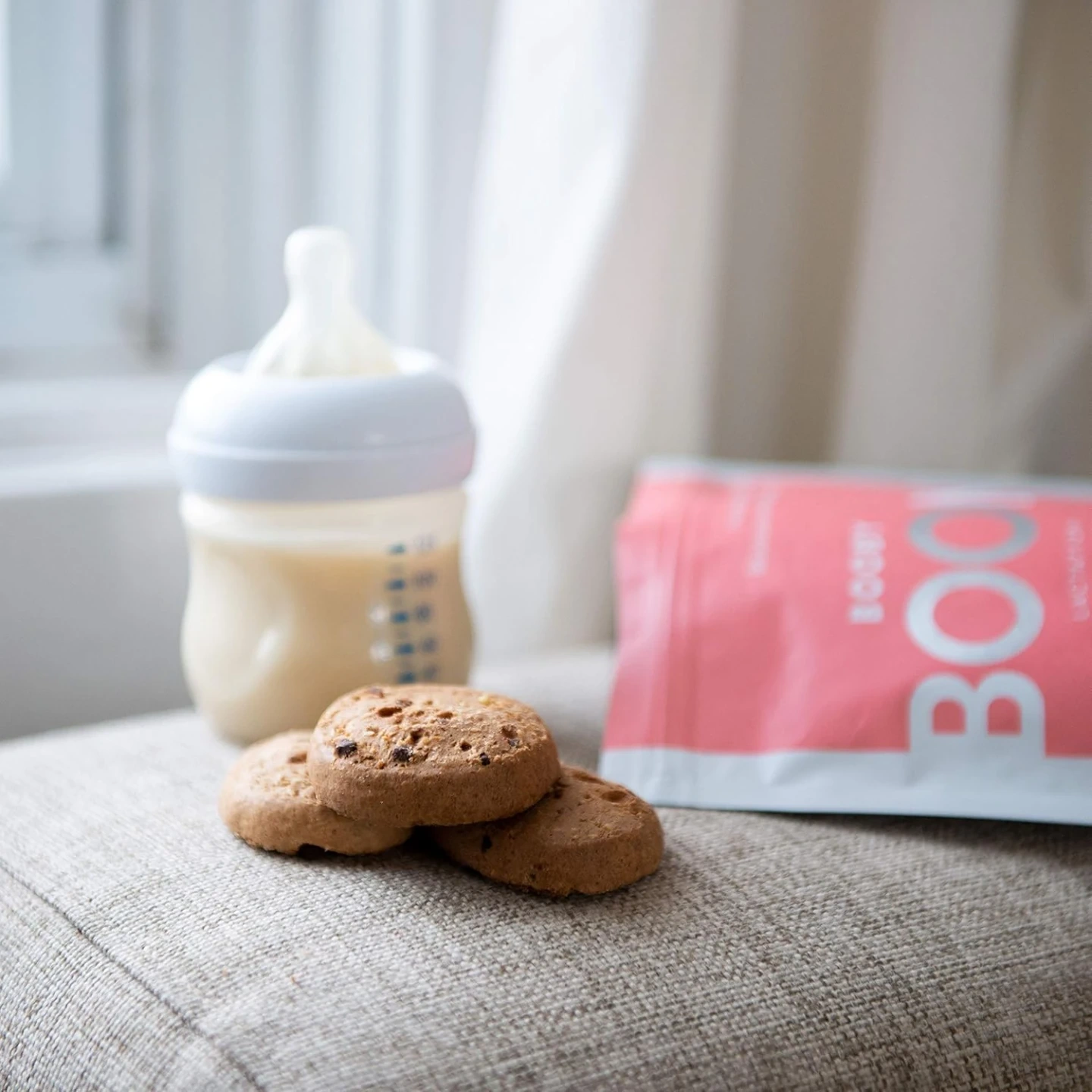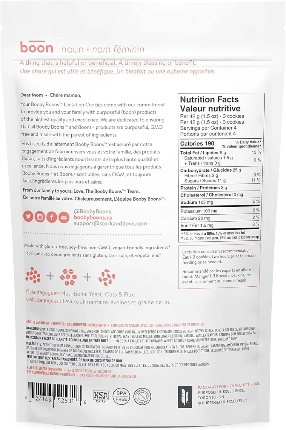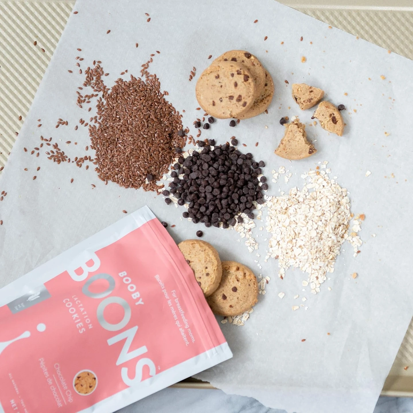 Booby Boons lactation cookies in chocolate chip flavour. Made in Canada with ingredients like oats, flaxseed, and chocolate chips. These cookies are 100% plant-based, gluten-free, and soy-free. Suitable for breastfeeding moms.