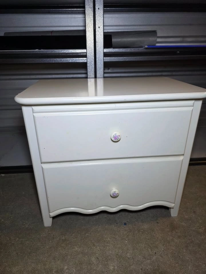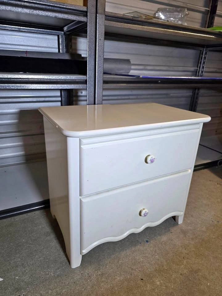 Beautiful Natart “Greta” Nightstand in a classic white finish, featuring elegant floral decorative knobs and solid wood construction. Natart is known for its high-quality craftsmanship and durable furniture, making this a quality piece that will last for years.