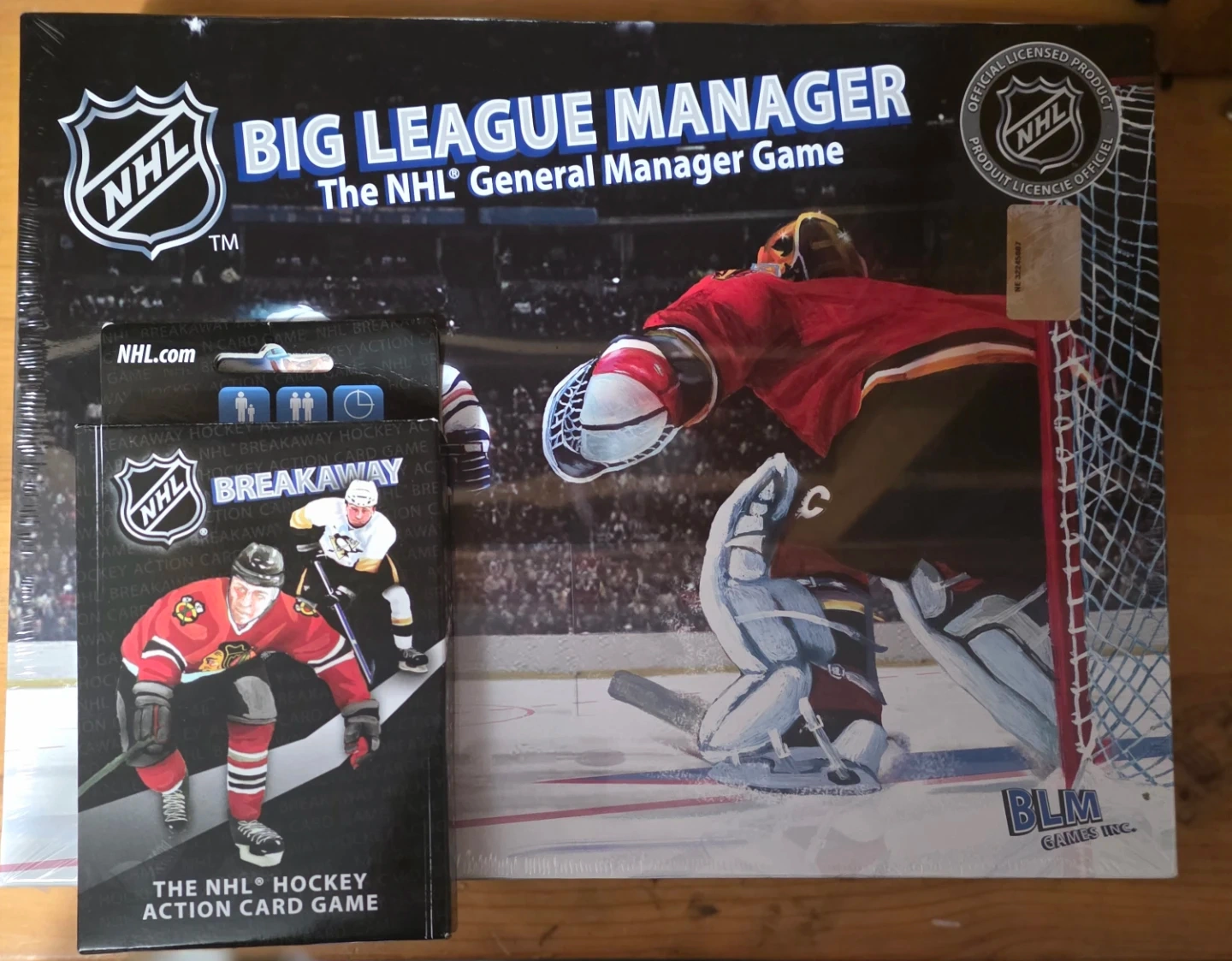 Get ready for some hockey action with this NHL Big League Manager game. It's a general manager simulation for hockey fans. This also includes the NHL Breakaway Hockey Action Card Game, offering more NHL fun. These games are officially licensed by the NHL!