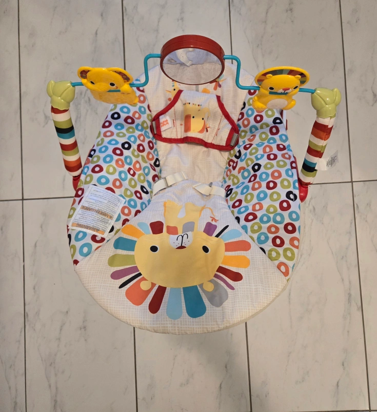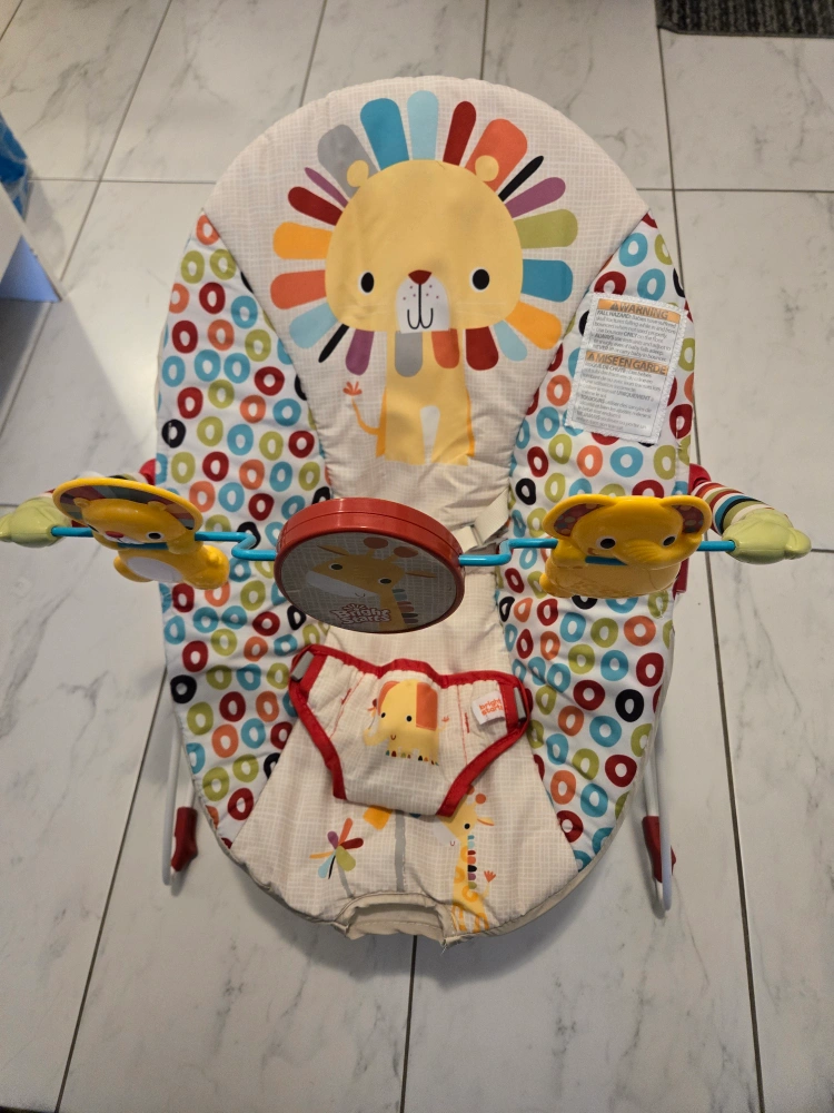 Adorable baby swing. Features a lion design. Includes toy bar. Vibrating function. Gently used. Soothes baby in an instant safe to use and easy to take anywhere as it is light.