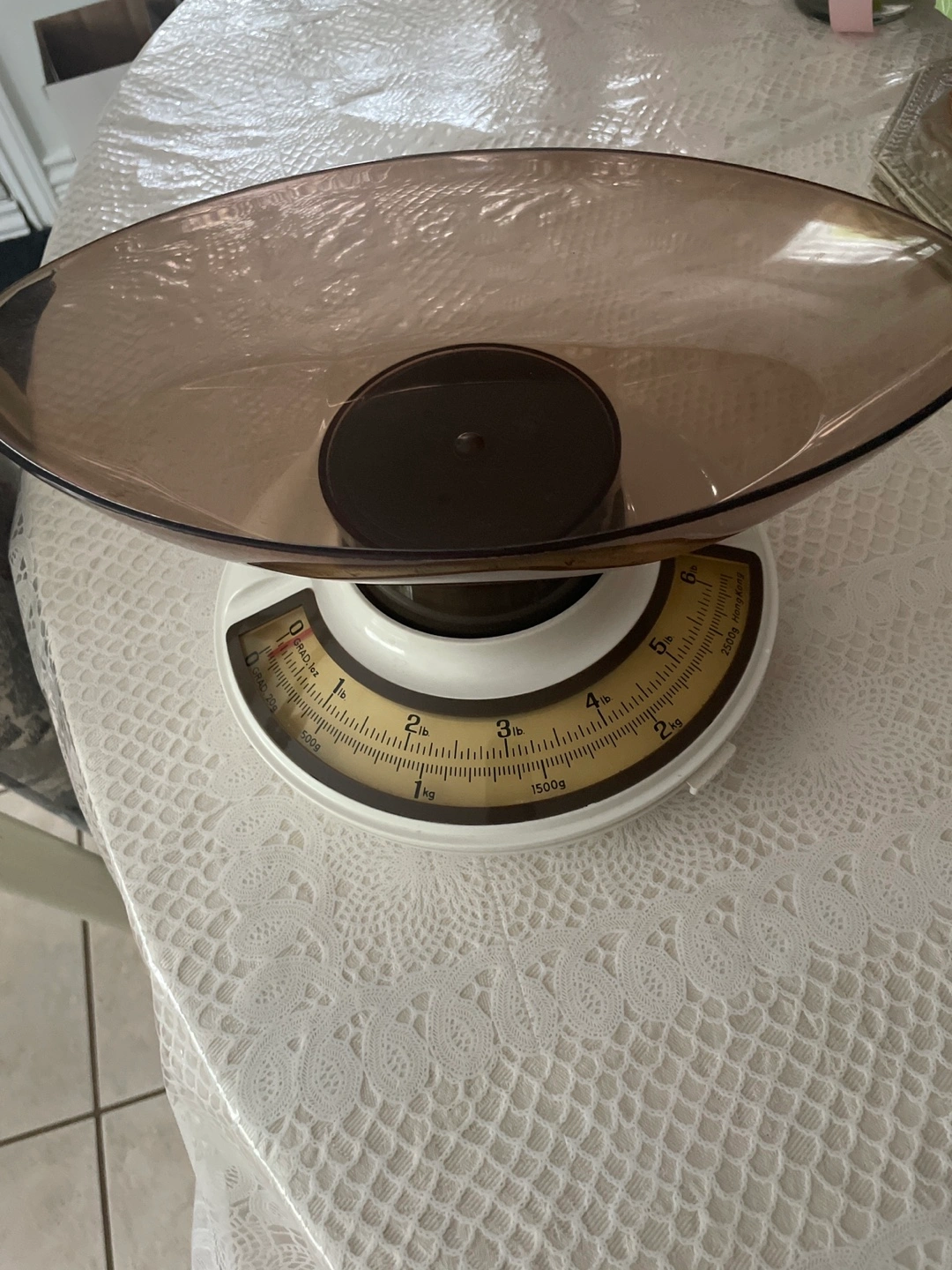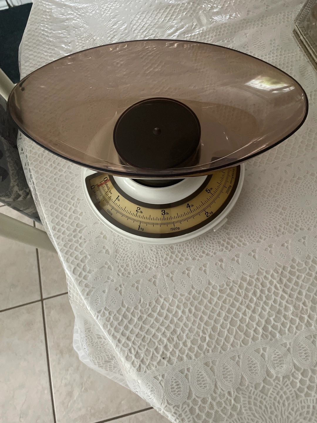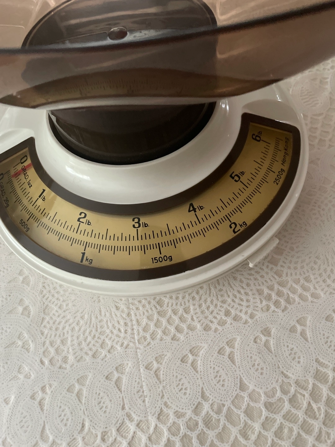 Selling a vintage kitchen scale, marked Hong Kong. It measures up to 6 pounds = 2.75 kg. Great for adding a retro touch to your baking in the kitchen!