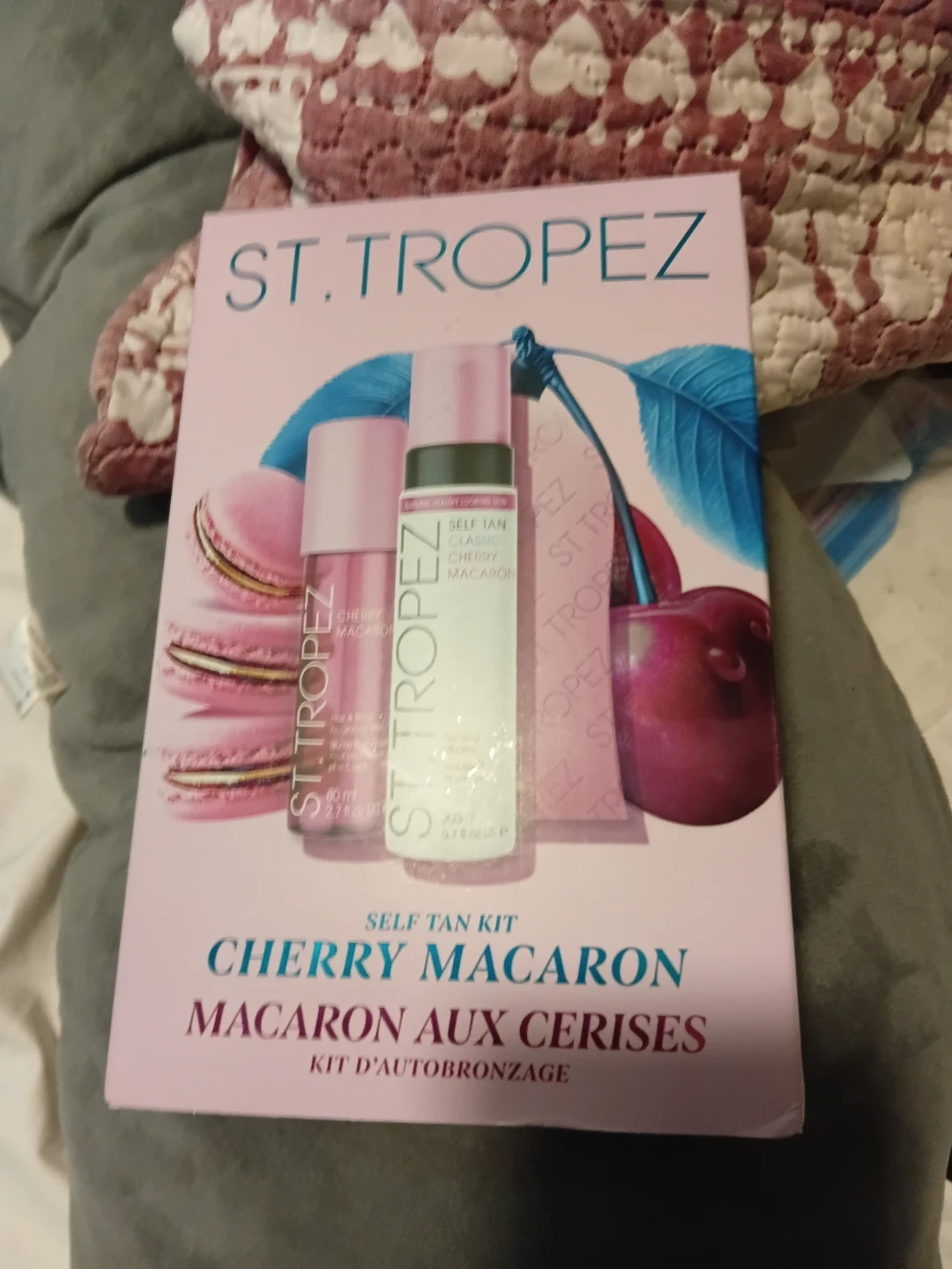 This is a St. Tropez Self Tan Cherry Macaron kit. It includes a classic cherry macaron self-tan product. 80ml bottle included.
