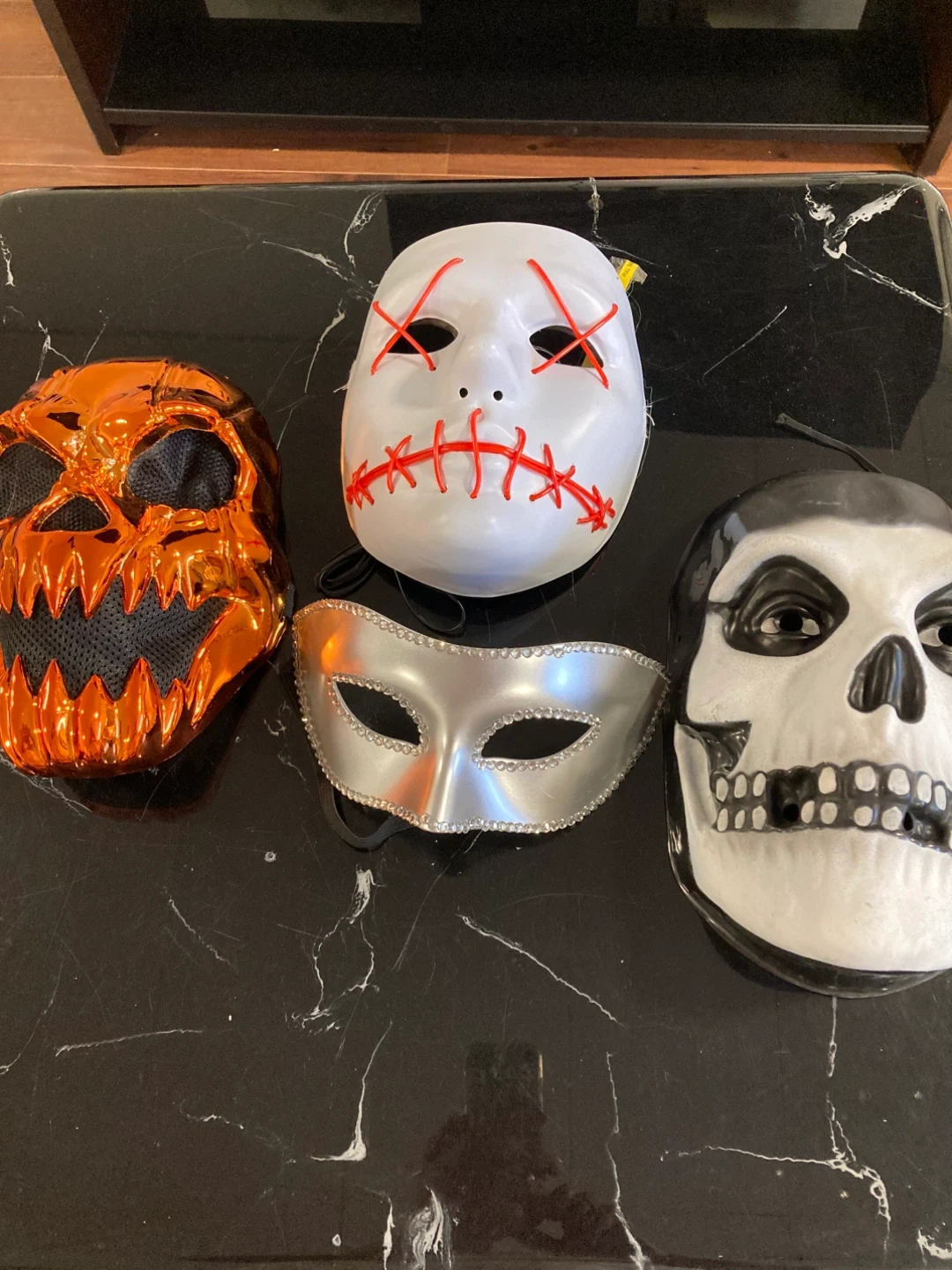 Get ready for Halloween with this set of four fun masks. Includes a spooky pumpkin mask, a classic skull mask, a white glow-in-the-dark light up mask with red stitching LED purge mask, and a silver masquerade mask. Great for parties and trick-or-treating!