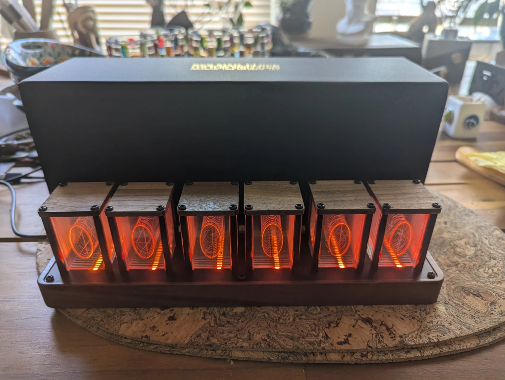 This is a clock that simulates the look of nixie tubes with LEDs. It is made of wood and has a black box. It is New.