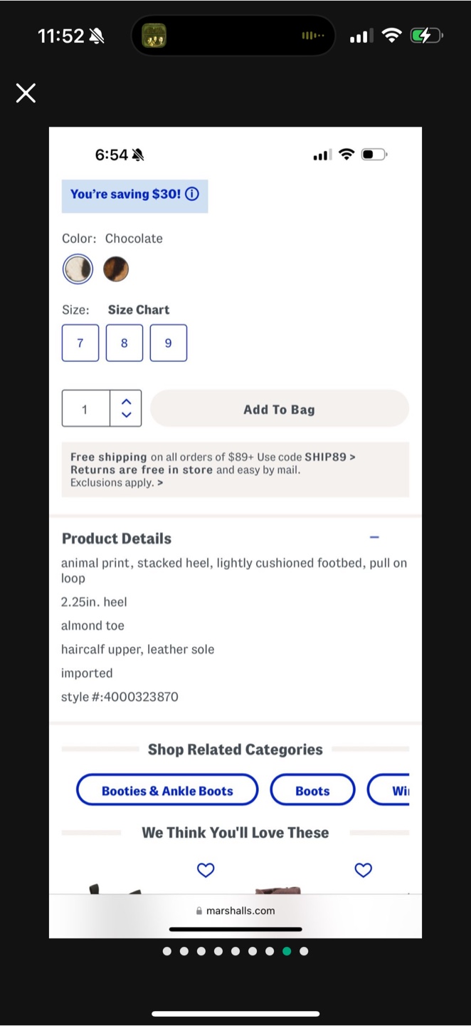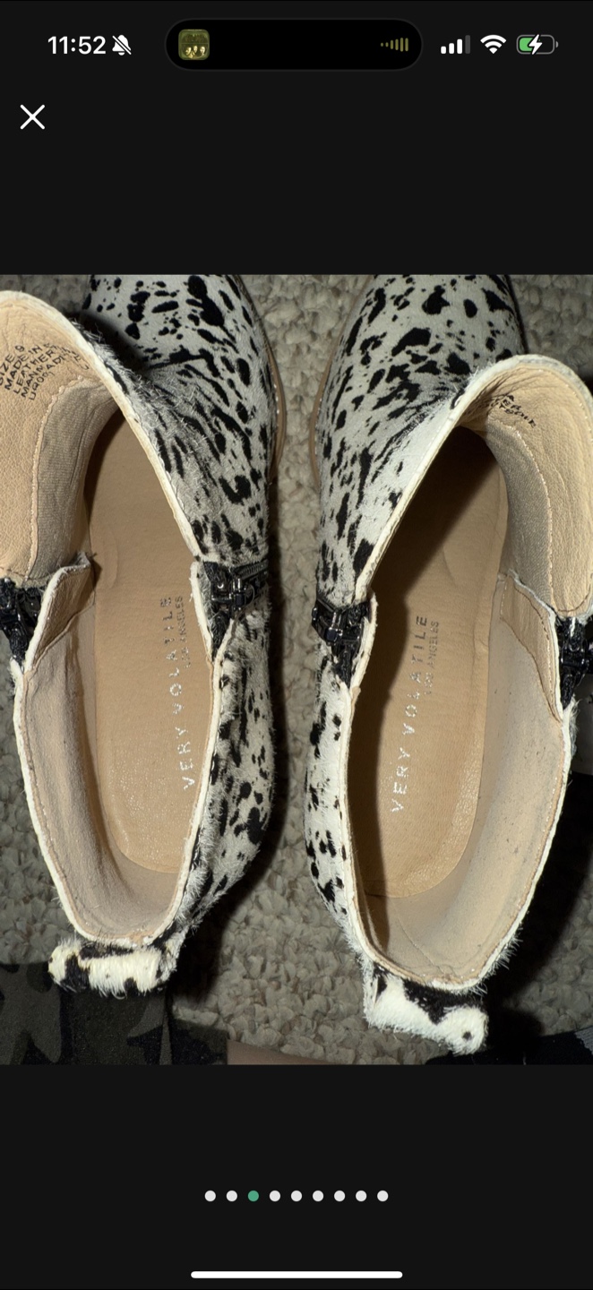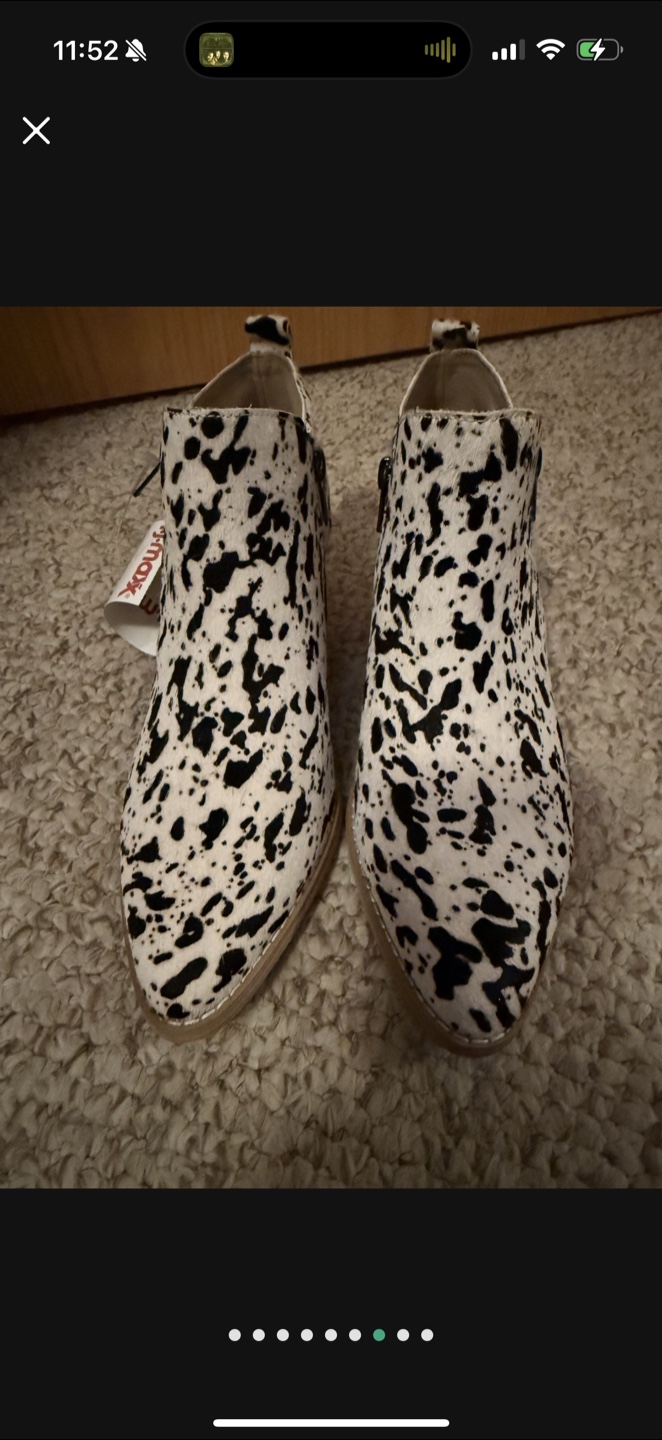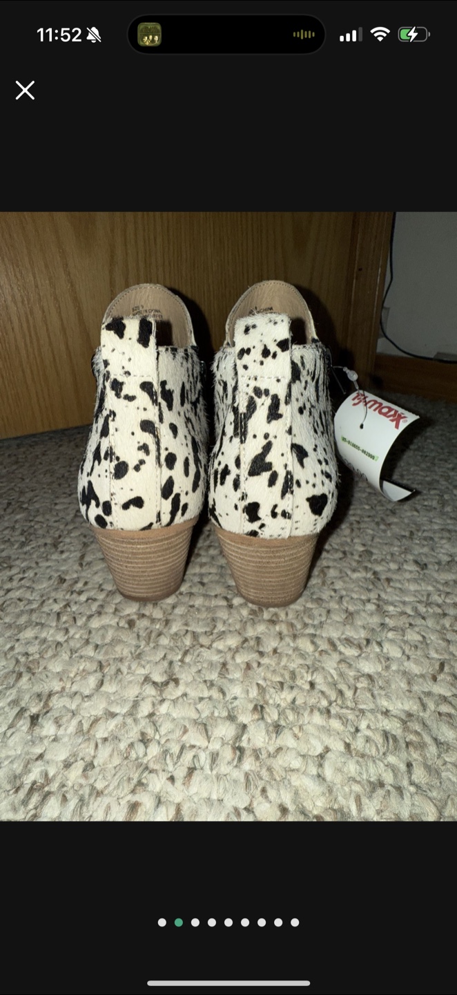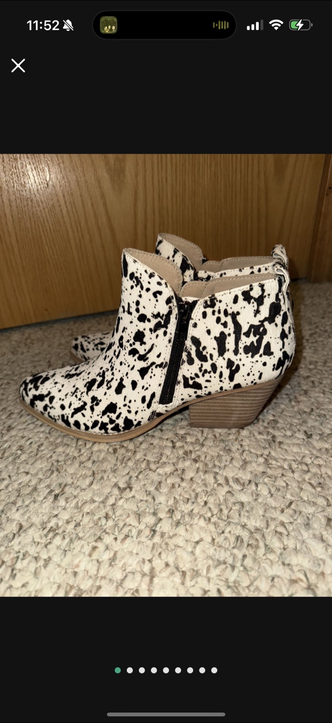 These ankle booties are a fun addition to any outfit! They feature a unique cow print design and a comfortable heel height. They are a size 9.