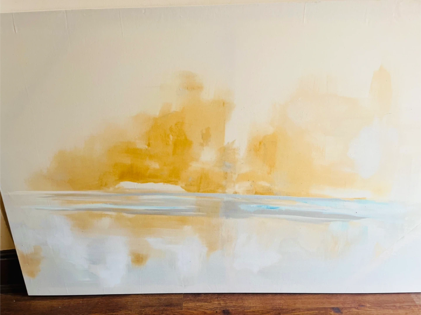 This is a real painting, a Large abstract painting with warm yellow, golds , and grey-blue tones. This artwork features a minimalist landscape design on canvas. It's a unique piece that would complement a modern decor.
