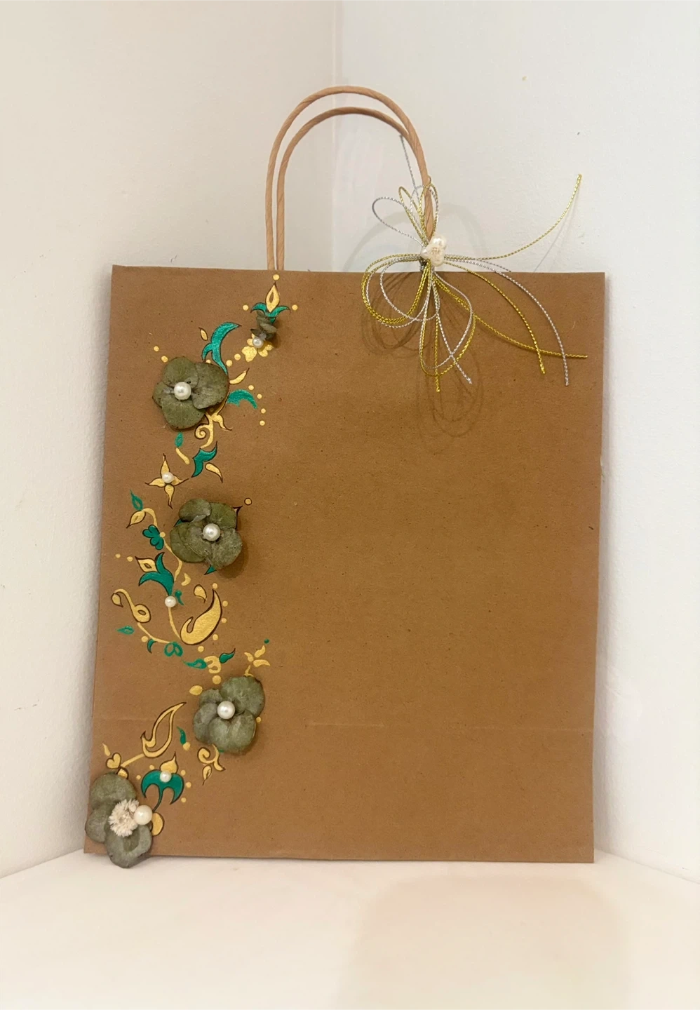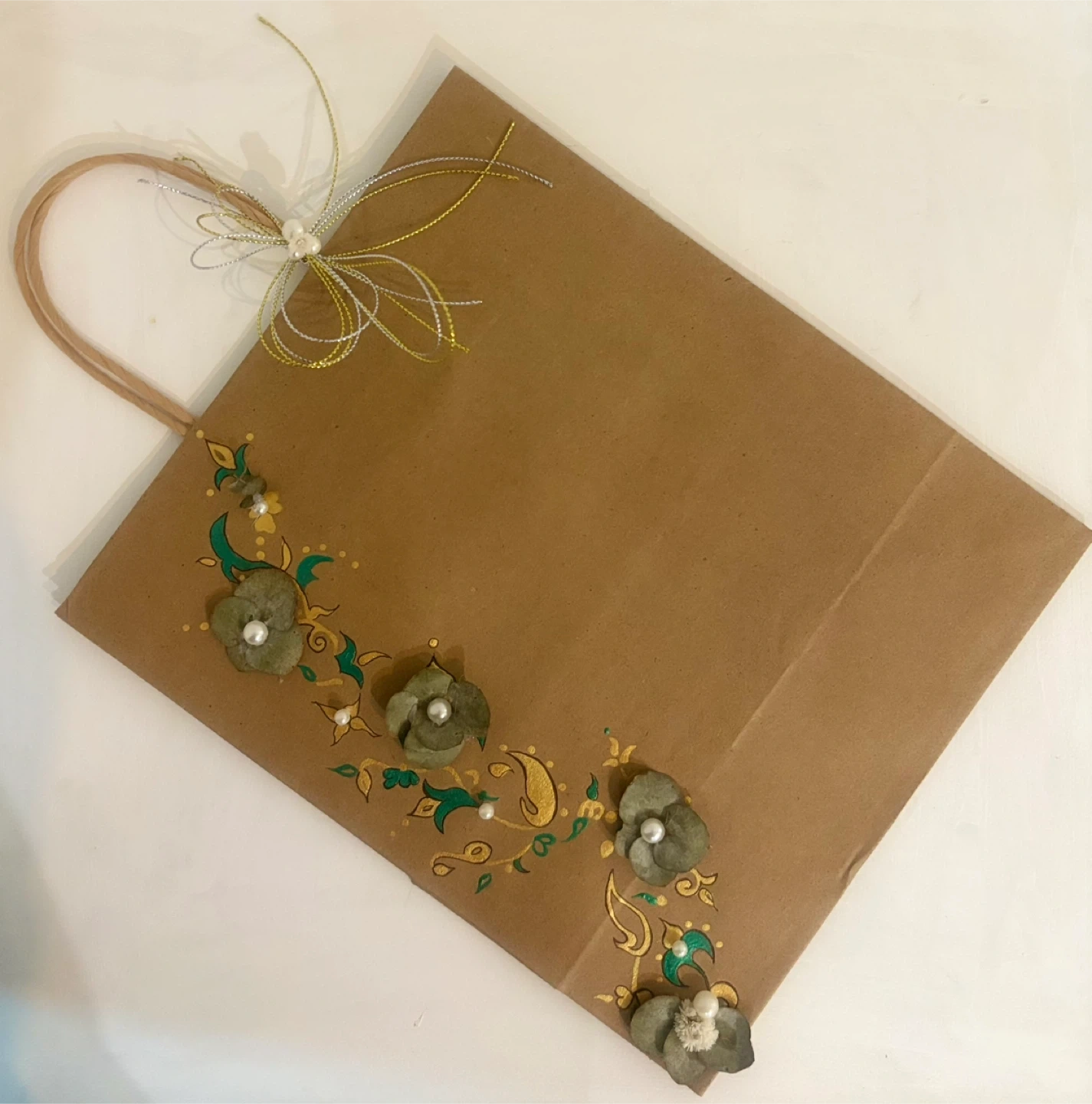 Selling a hand-painted brown paper gift bag. It has a floral design with green and gold accents and pearl embellishments. Perfect for a special occasion!