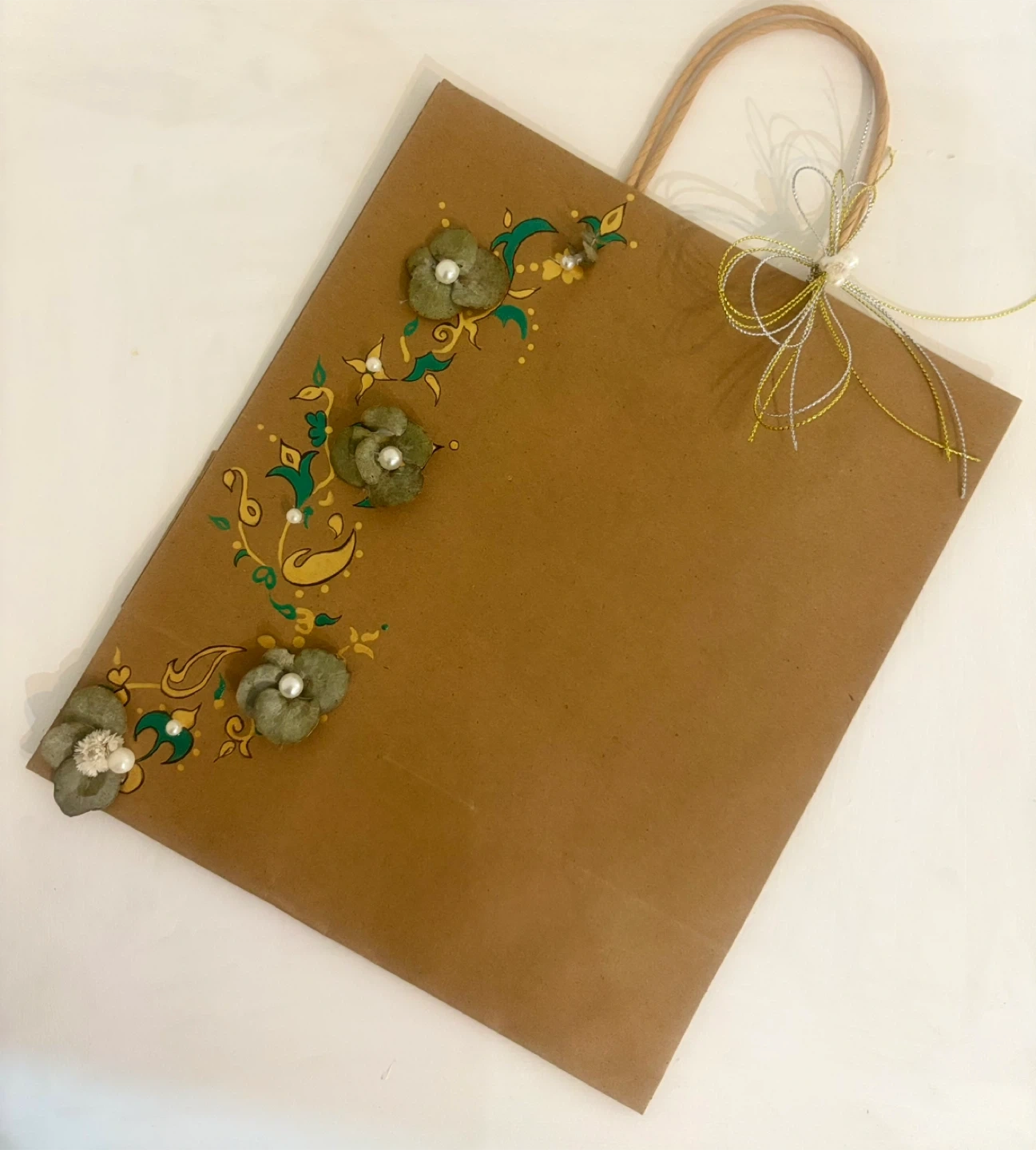 Selling a hand-painted brown paper gift bag. It has a floral design with green and gold accents and pearl embellishments. Perfect for a special occasion!