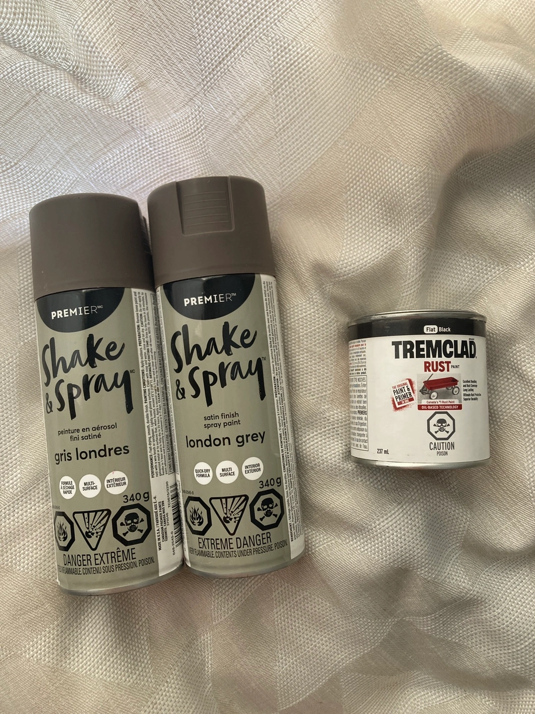 Selling two cans of Premier Shake & Spray in London Grey (340g) and one can of Tremclad Flat Black paint (237ml) for rust coverage. Bought last summer at Canadian Tire for about $50 but never used.