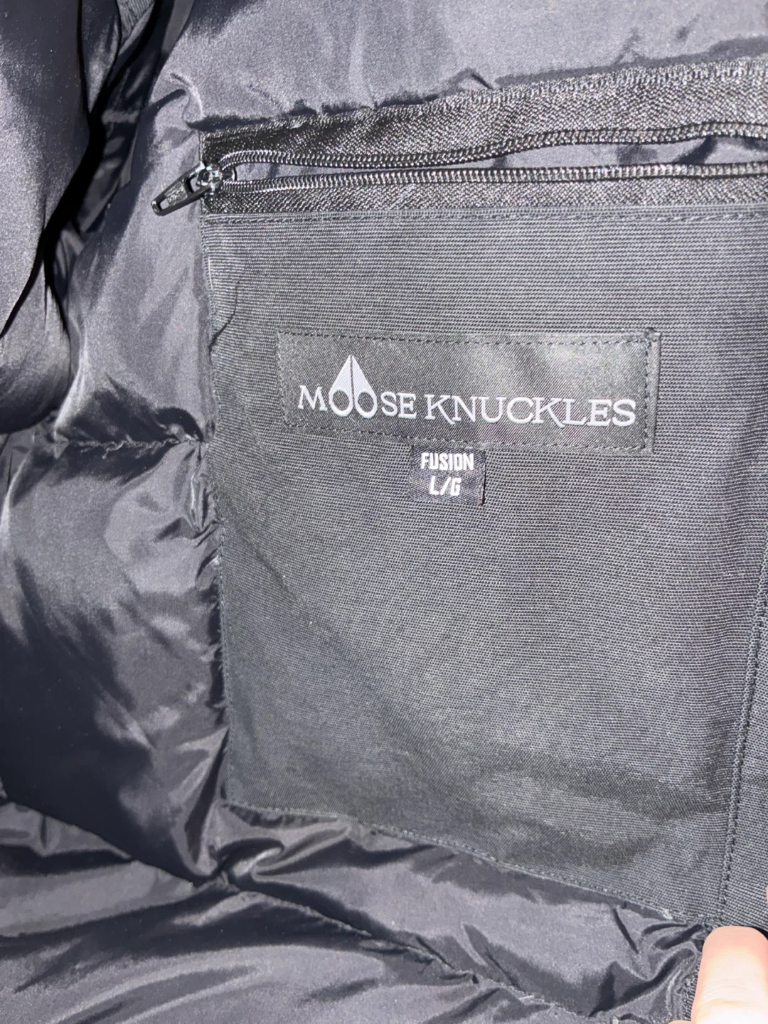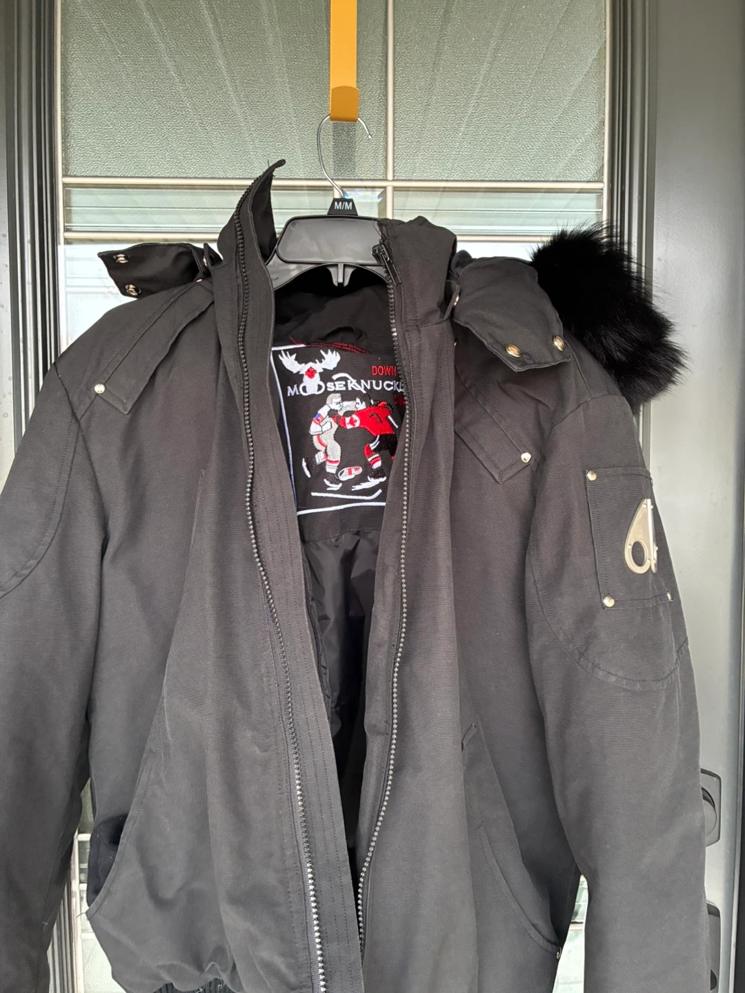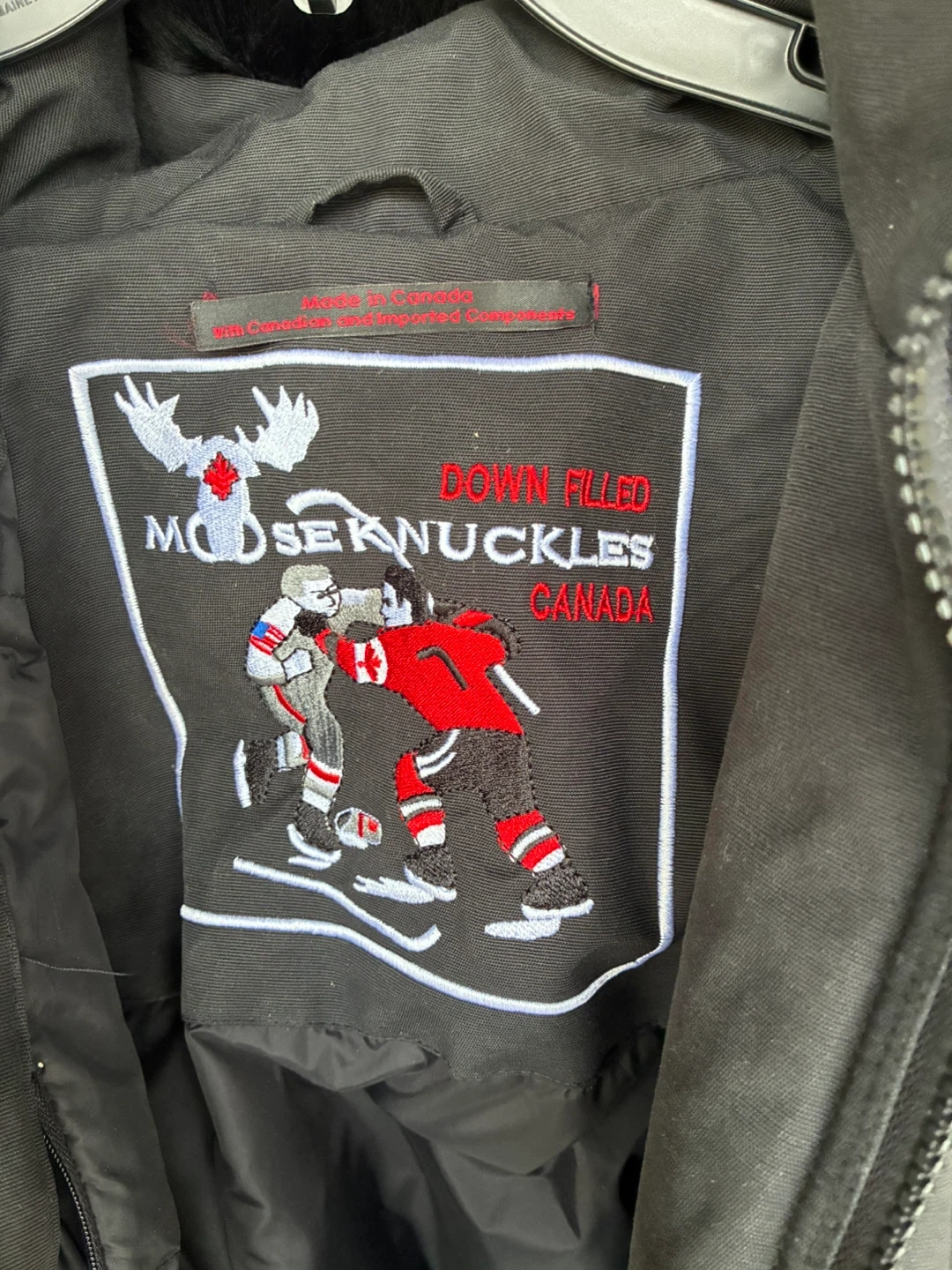 Moose Knuckles down filled parka jacket, made in Canada with Canadian down. Features a black outer shell and a black fur-lined hood. Size L/G.
