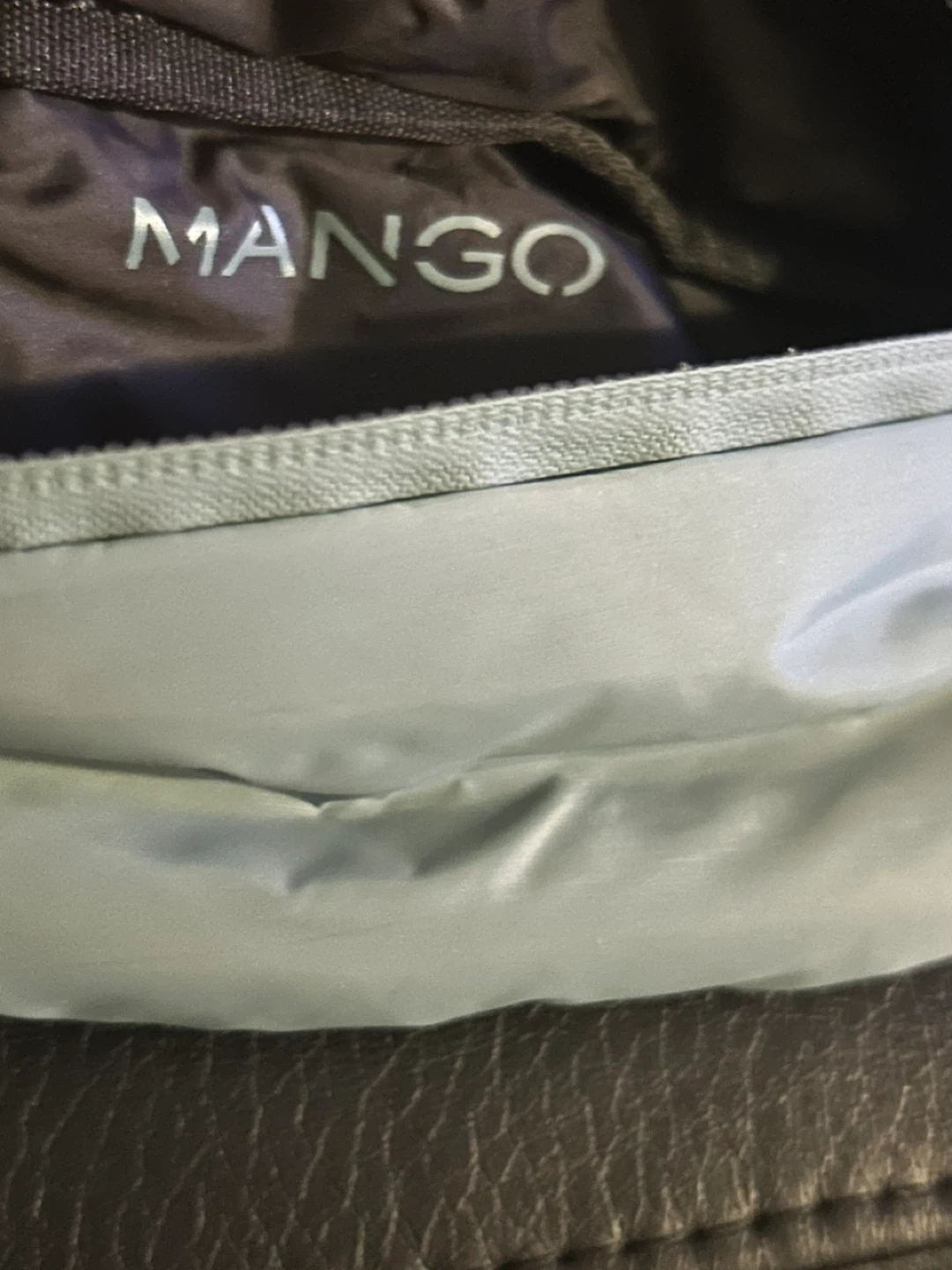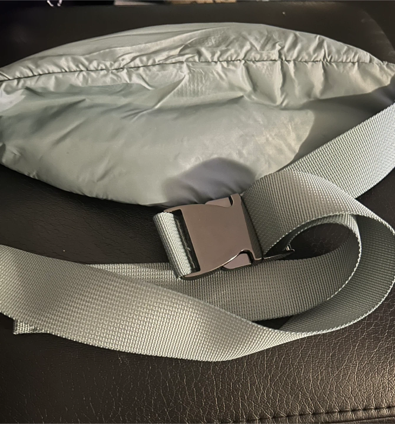 This is a MANGO fanny pack in a light blue colour. It's made of polyester material. It has an adjustable strap with a buckle closure.