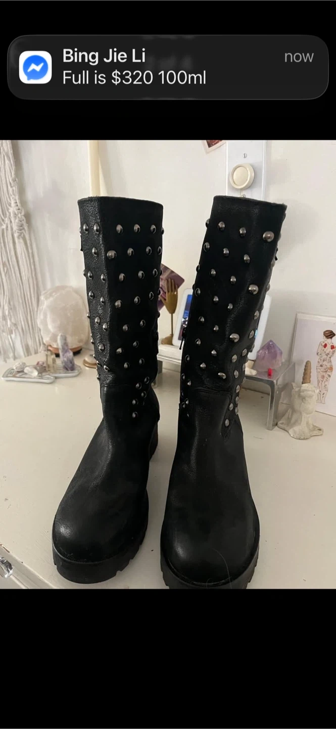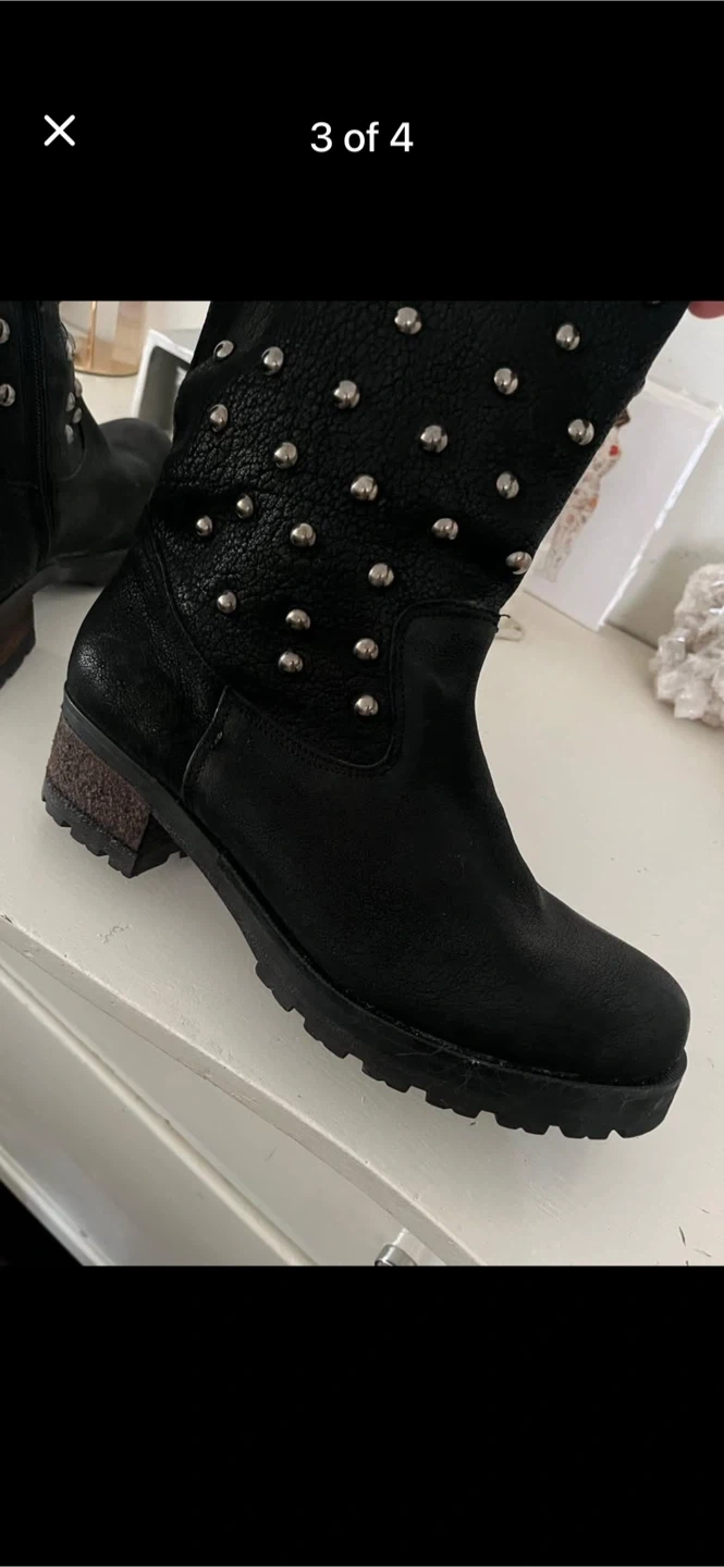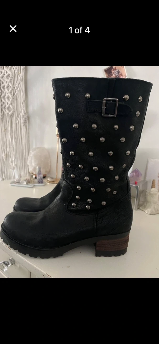 Black leather mid-calf boots with silver stud detailing. They feature a side buckle strap and a low stacked heel. These boots are perfect for adding a bit of edge to any outfit!