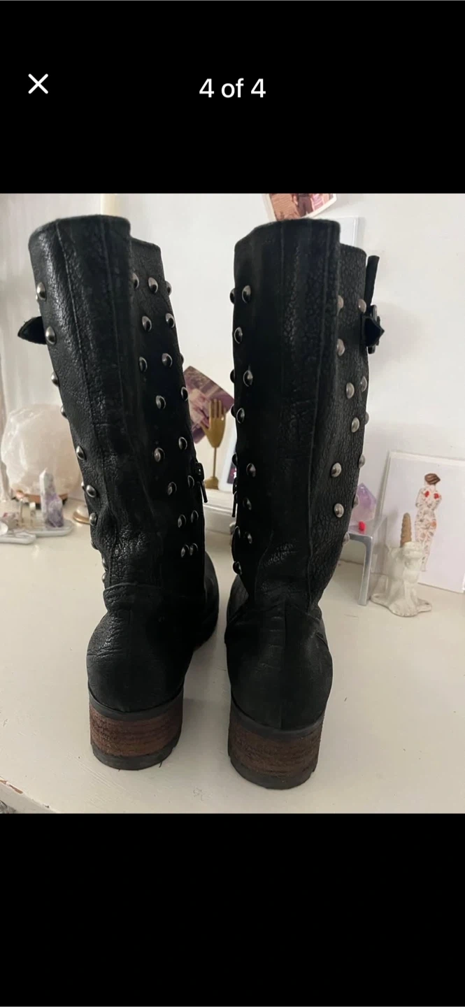Black leather mid-calf boots with silver stud detailing. They feature a side buckle strap and a low stacked heel. These boots are perfect for adding a bit of edge to any outfit!