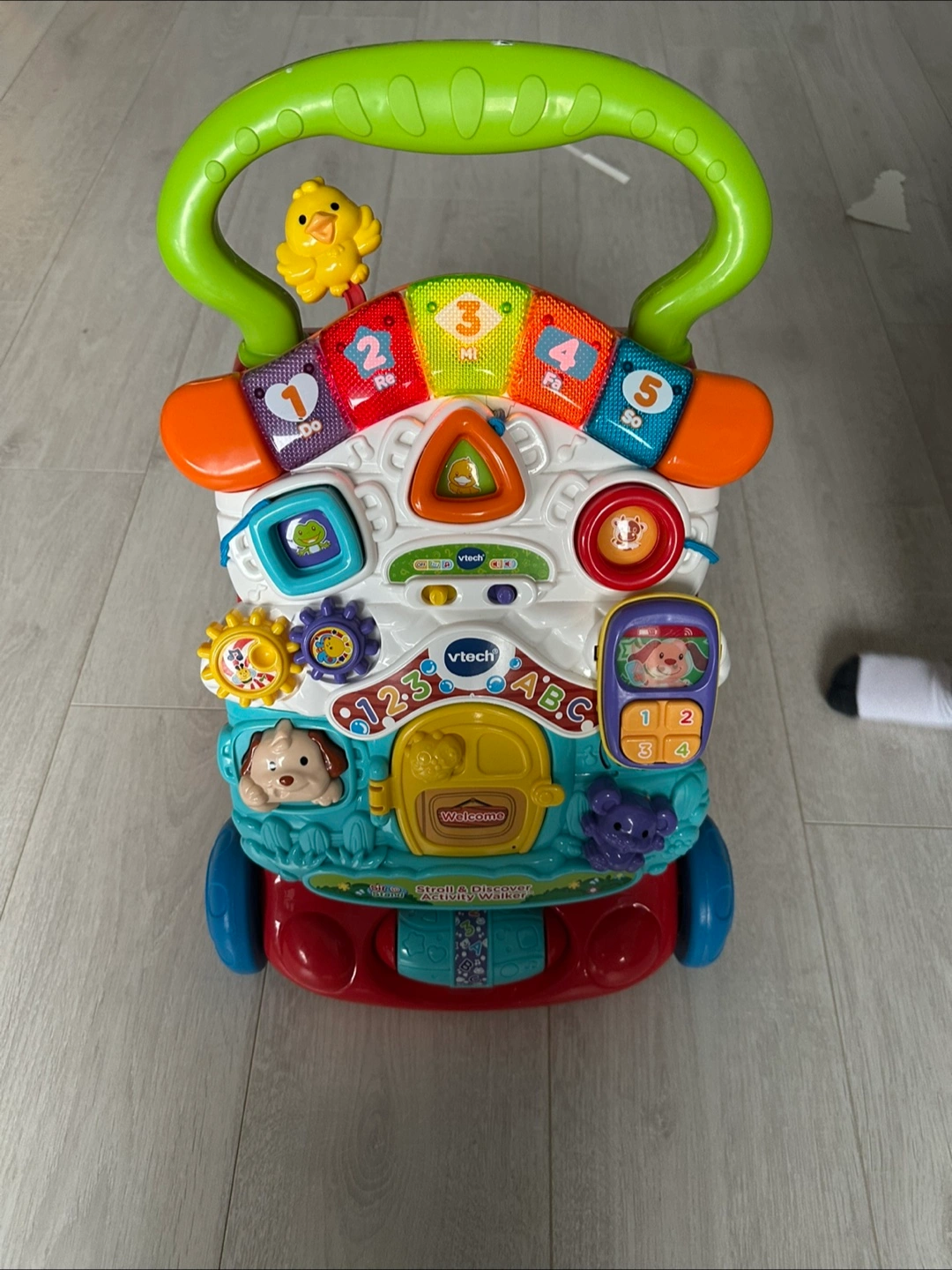 This VTech Sit-to-Stand Activity Walker has colourful buttons and interactive activities. It's designed to help babies learn to walk and play. It includes a piano with musical notes, number buttons, and animal friends.