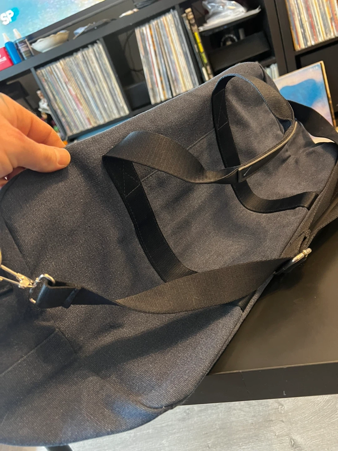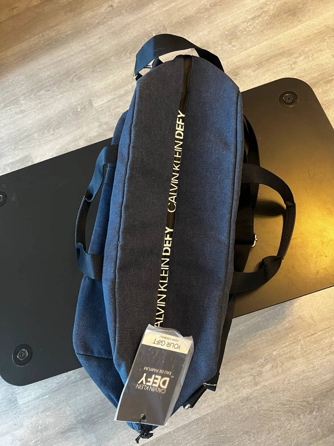 This is a Calvin Klein Defy duffle bag. It's dark blue with black handles and a detachable shoulder strap. There's also a tag attached that says 'YOUR GIFT' and 'CALVIN KLEIN DEFY EAU DE PARFUM'.